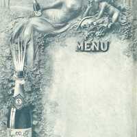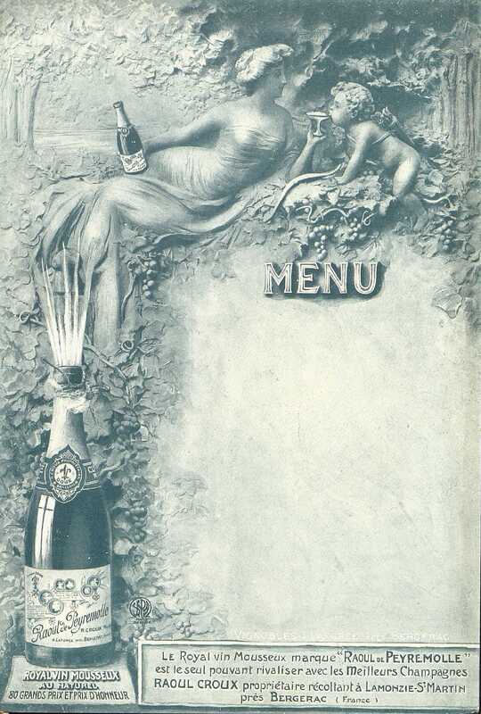 Menu publicitaire vierge. Mousseux Raoul de Peyremolle. Vignobles à Laforce près Bergerac. Royal Vin Mousseux au naturel. 80 grands prix et prix d'honneur.S.F.P.A. Illustration : Cupidon sur des vigne boit une coupe de vin mousseux tendue par déesse en robe de voiles tenant la bouteille du breuvage.
