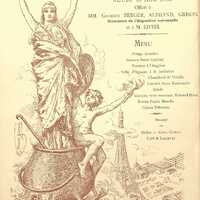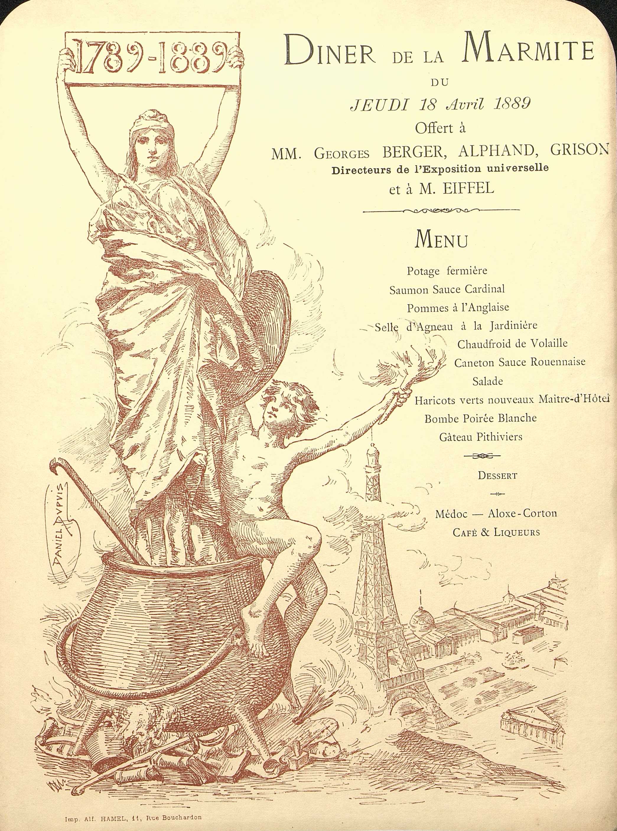 Dîner de la Marmite, illustré et en rapport avec L'Exposition universelle de Paris de 1889 à l'issue de laquelle fut construite la Tour Eiffel. Allégorie du centenaire de la République accompagné d'un enfant nu tenant une torche enflammée sortant d'une marmite reposant sur des ferrailles incandescentes la Tour Eiffel et les bâtiments de l'exposition universelle en perspective.