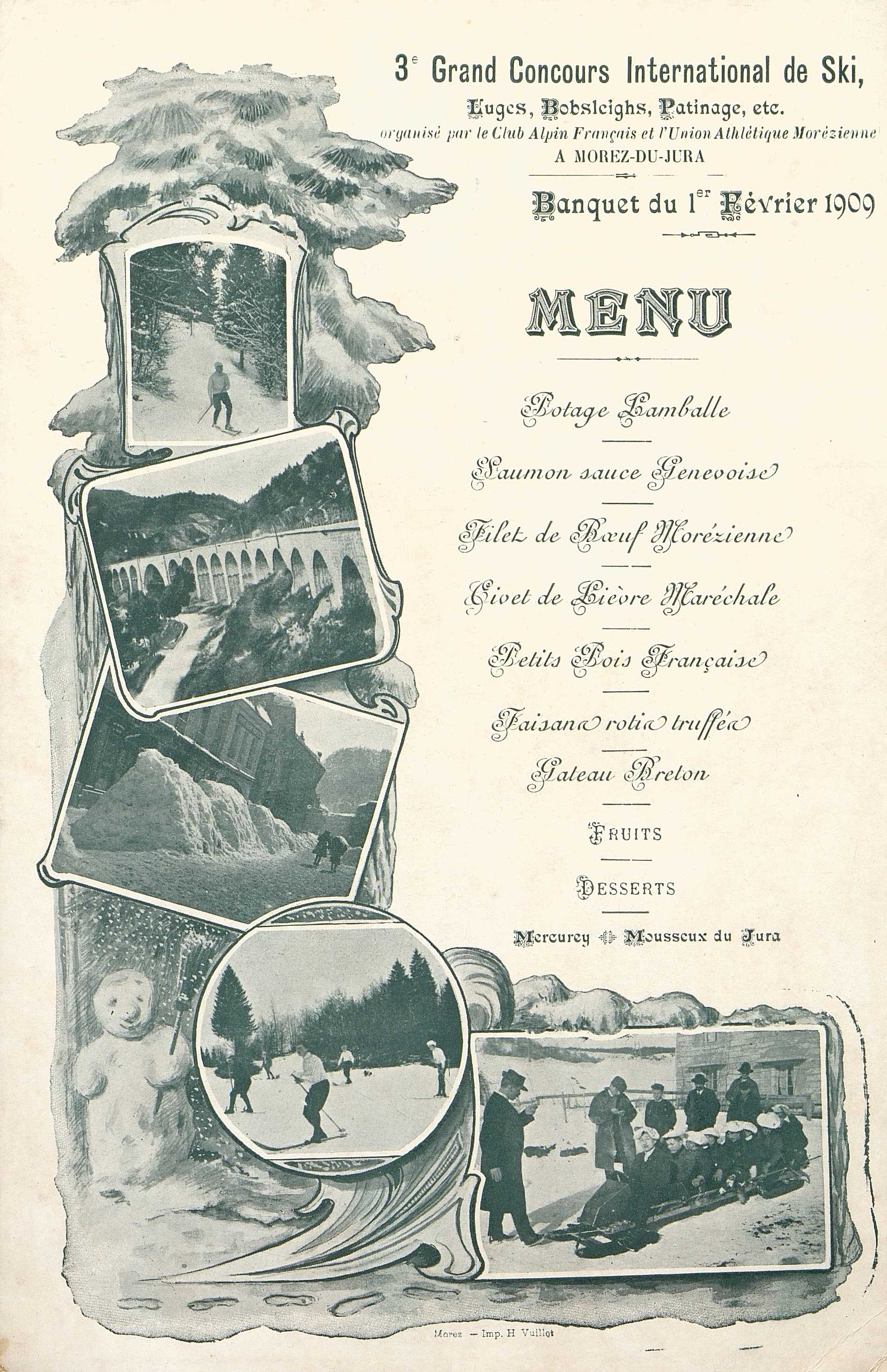 Menu du 3ème Grand concours international de ski. Illustration : cinq vignettes photographiques : descente en skis, viaduc ferroviaire, neige en centre ville. Ski et luge collective de descente.