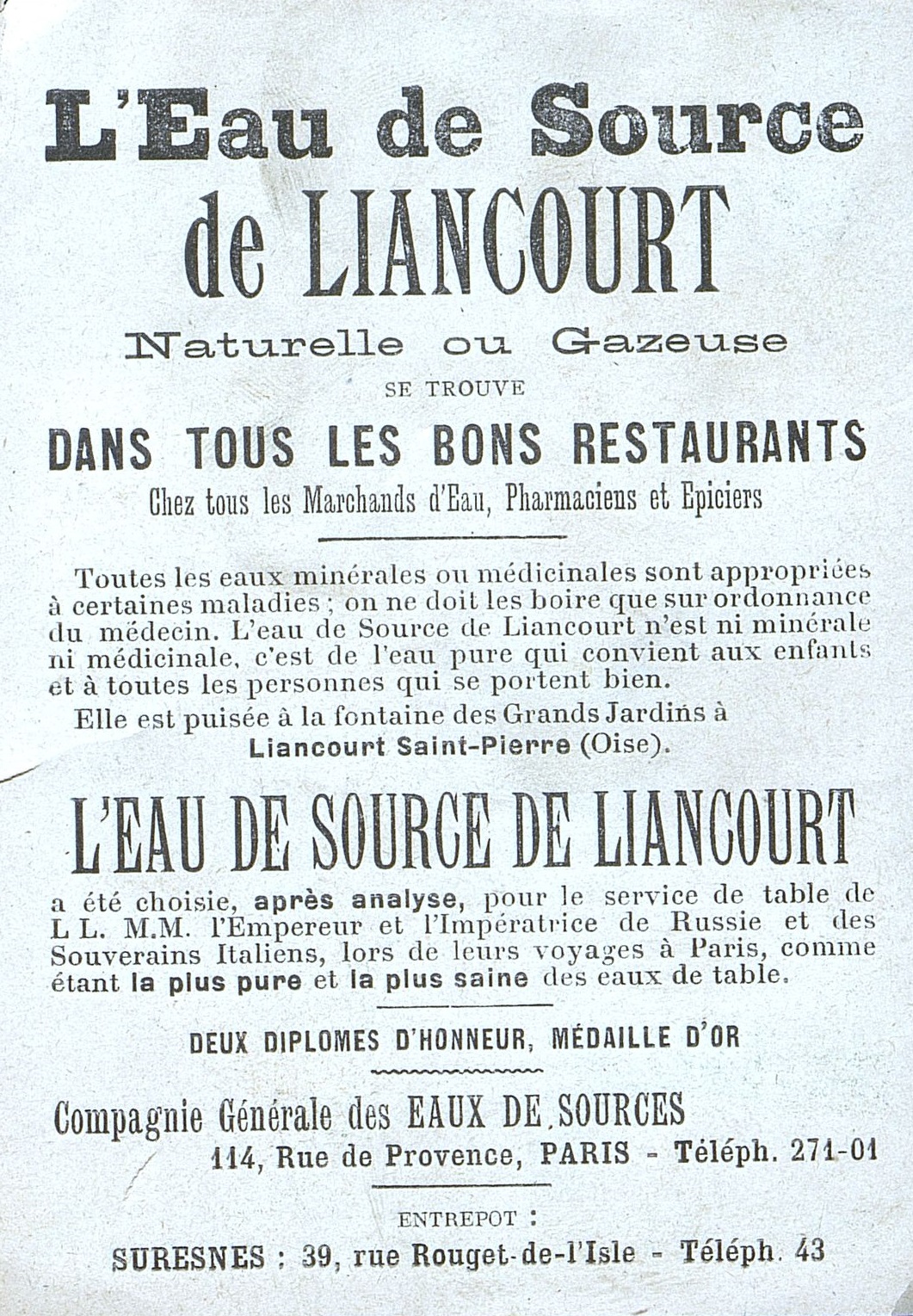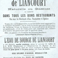 Carte publicitaire pour leau de source Eau de Liancourt.Liancourt-Saint-Pierre (Oise)