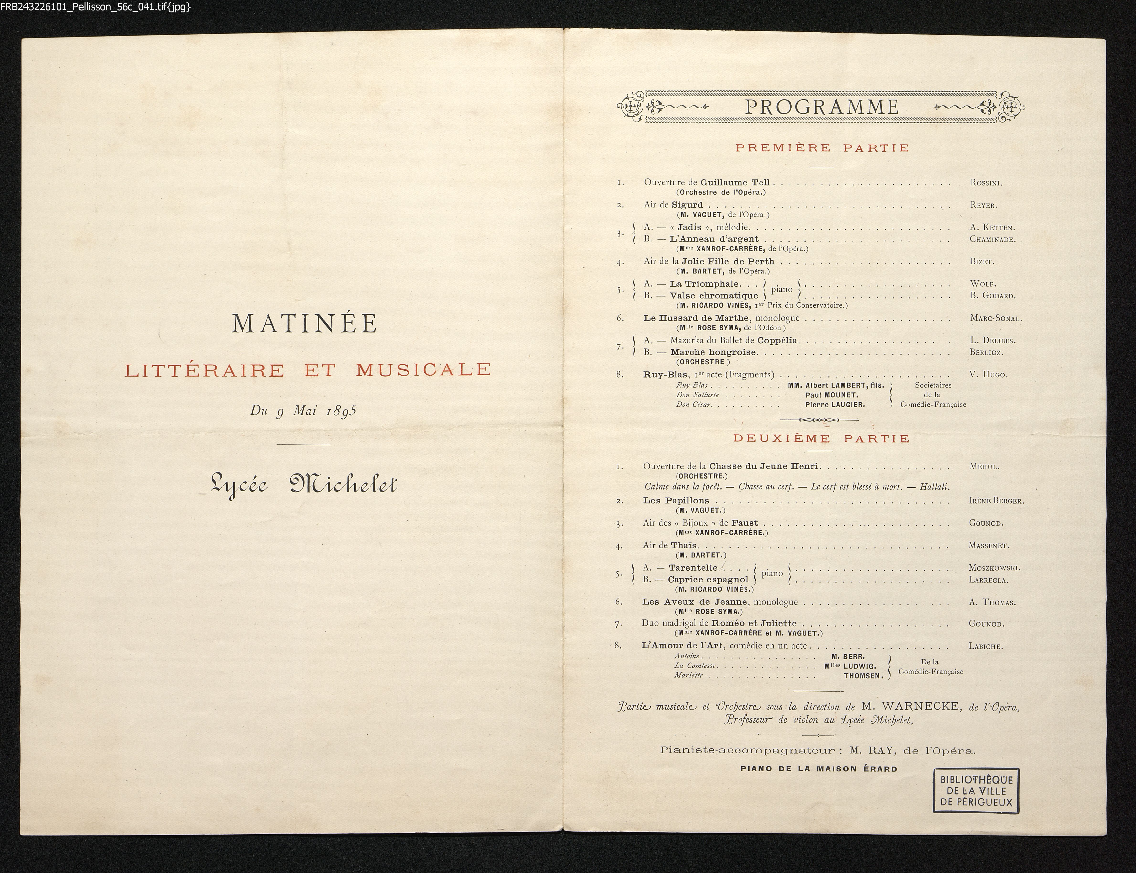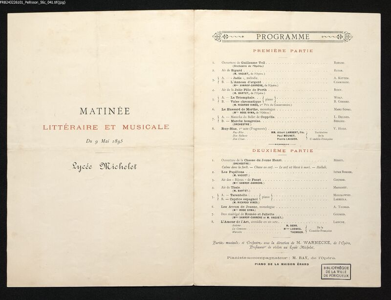 Programme musical extrait d'une revue : Matinée Littéraire et Musicale du 9 mai 1895 au Lycée Michelet.