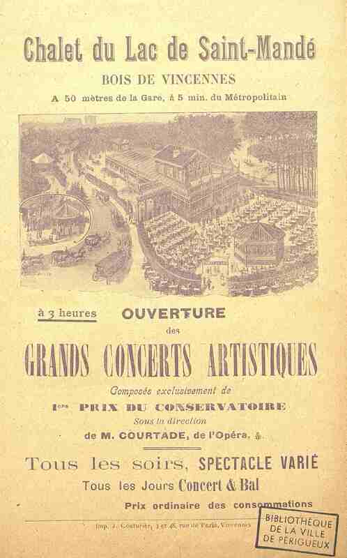 Grands concerts artistiques, Chalet du Lac de Saint-Mandé, Document publicitaire illustré pour une salle de musiques, bals et loisirs à Paris.