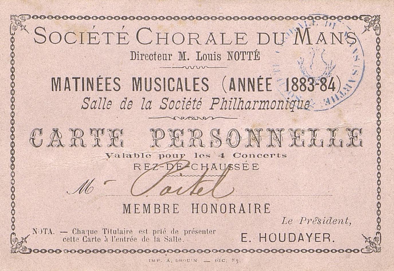 Carte personnelle saison 1883-1884.
