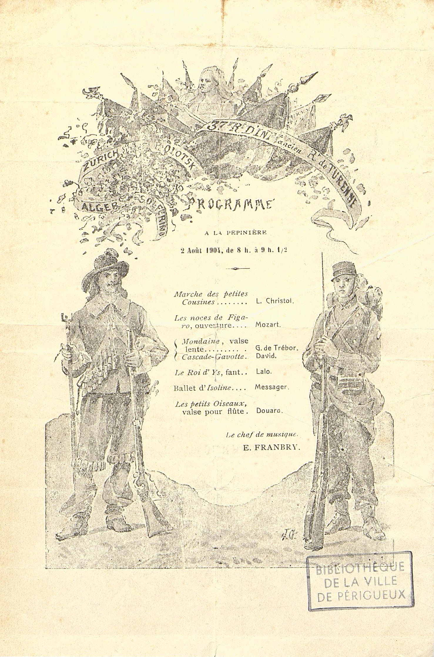 Programme du concert illustré de deux fantassins du 37e Régiment d'Infanterie, anciennement Régiment de Turenne.