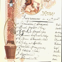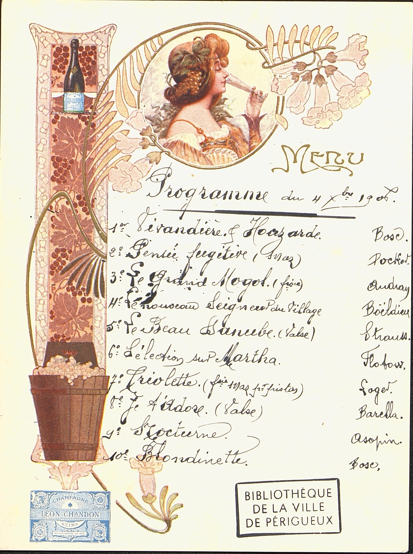 Programme en manuscrit d'un concert manuscrit sur carte de menu, daté du 4 décembre 1906. Ce menu porte un timbre publicitaire pour le Champagne Léon Chandon.