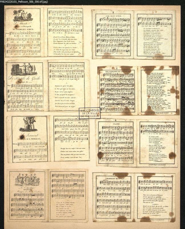 Petites vignettes avec des partitions musicales.