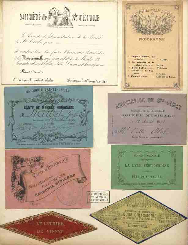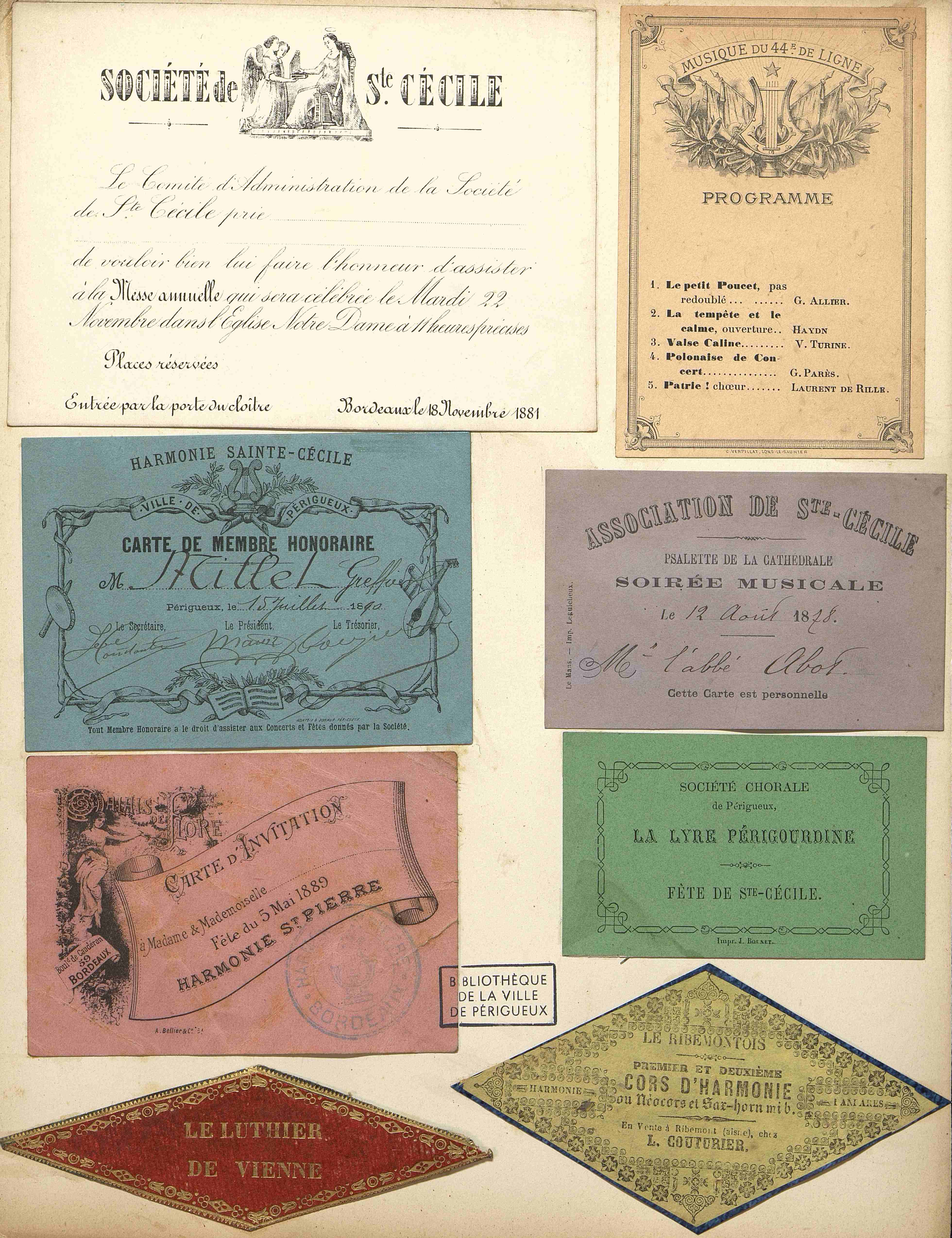 Carte de membre honoraire de l'Harmonie de Ste-Cécile de Périgueux. Datée du 15 juillet 1890. Ronteix et Bonhur imp. à Périgueux.