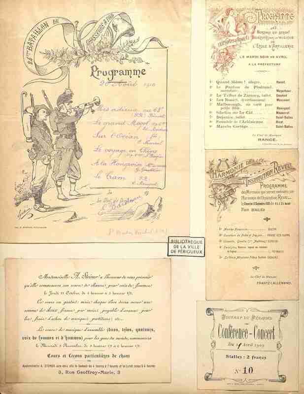 Programme musical du XIIe Corps d'Armée, s.d. et possiblement à Angoulême : Quand même !, Le pardon de Ploërmel, Le Tribut de Zamora, Les Rosati, Malborough, Sélection sur le Cid, Déjanire, Farandole de l'Arlésienne, Marche Cortège. imp. Dupuy fils à Angoulême.