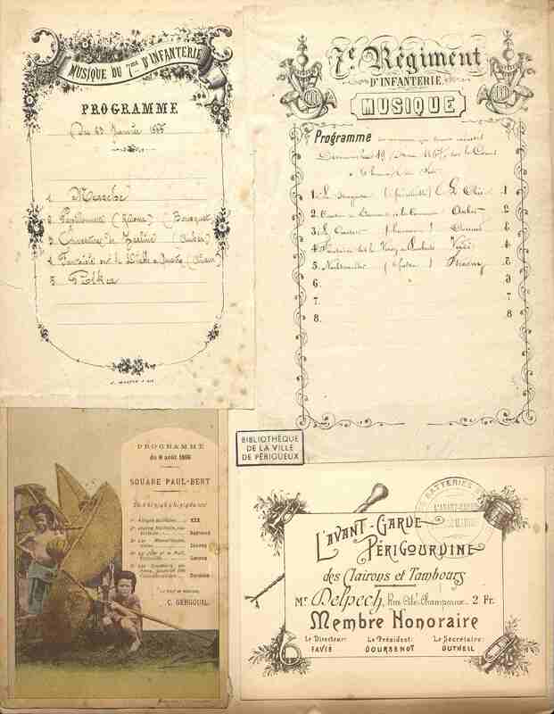 Programme de musique militaire en Indochine en date du 6 août 1896 : Allegro Militaire, Jeanne Maillotte, Les Merveilleuses, Le Jour et la Nuit, Les Courriers Aériens. ed. J. Schneider à Hanoï.