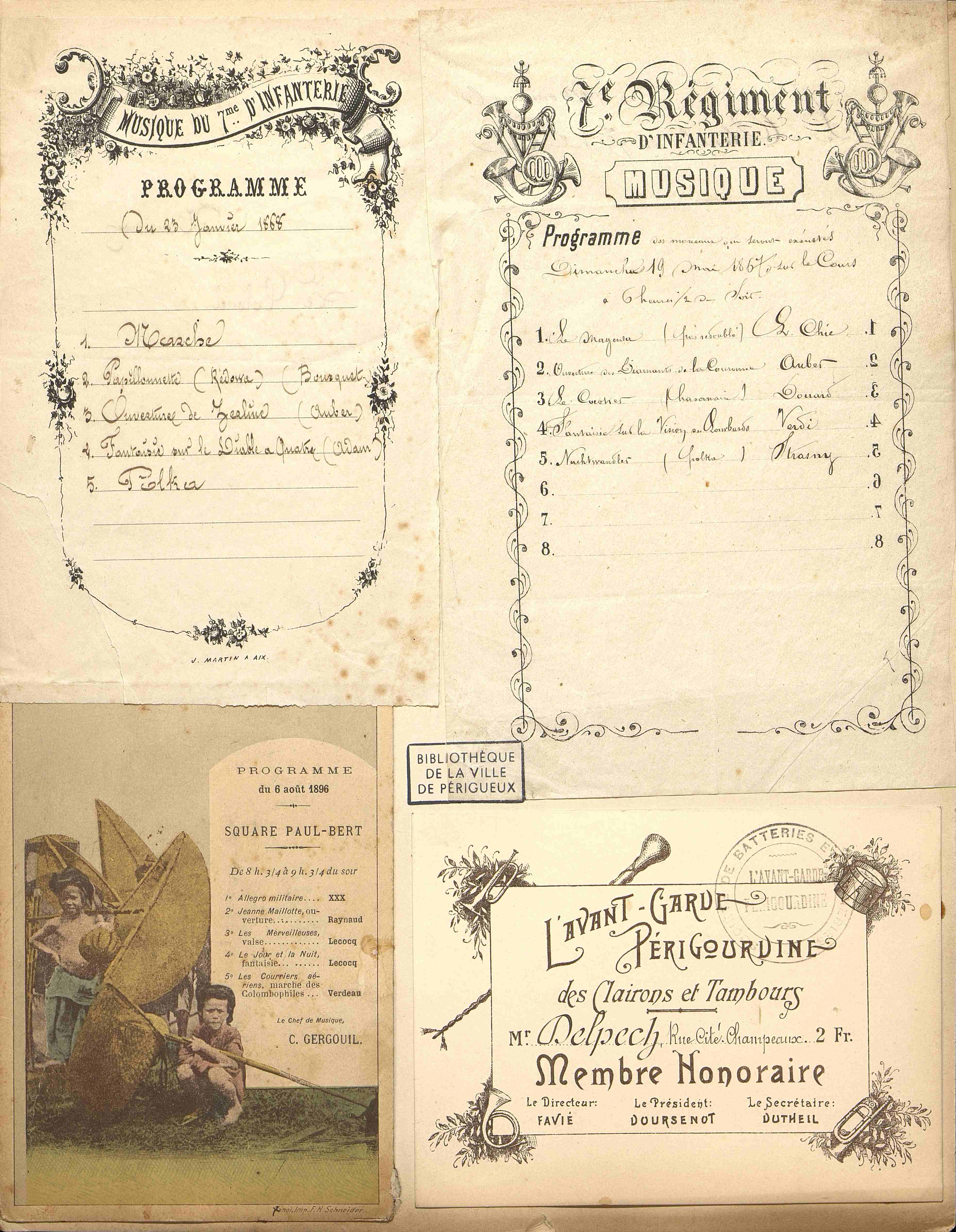 Programme de musique du 7e d'Infanterie en date du 23 janvier 1868 : Marche, Papillonnette, Ouverture de Jezline (?), Fantaisie sur le Diable à Quatre, Polka. ed. J. Martin à Aix.