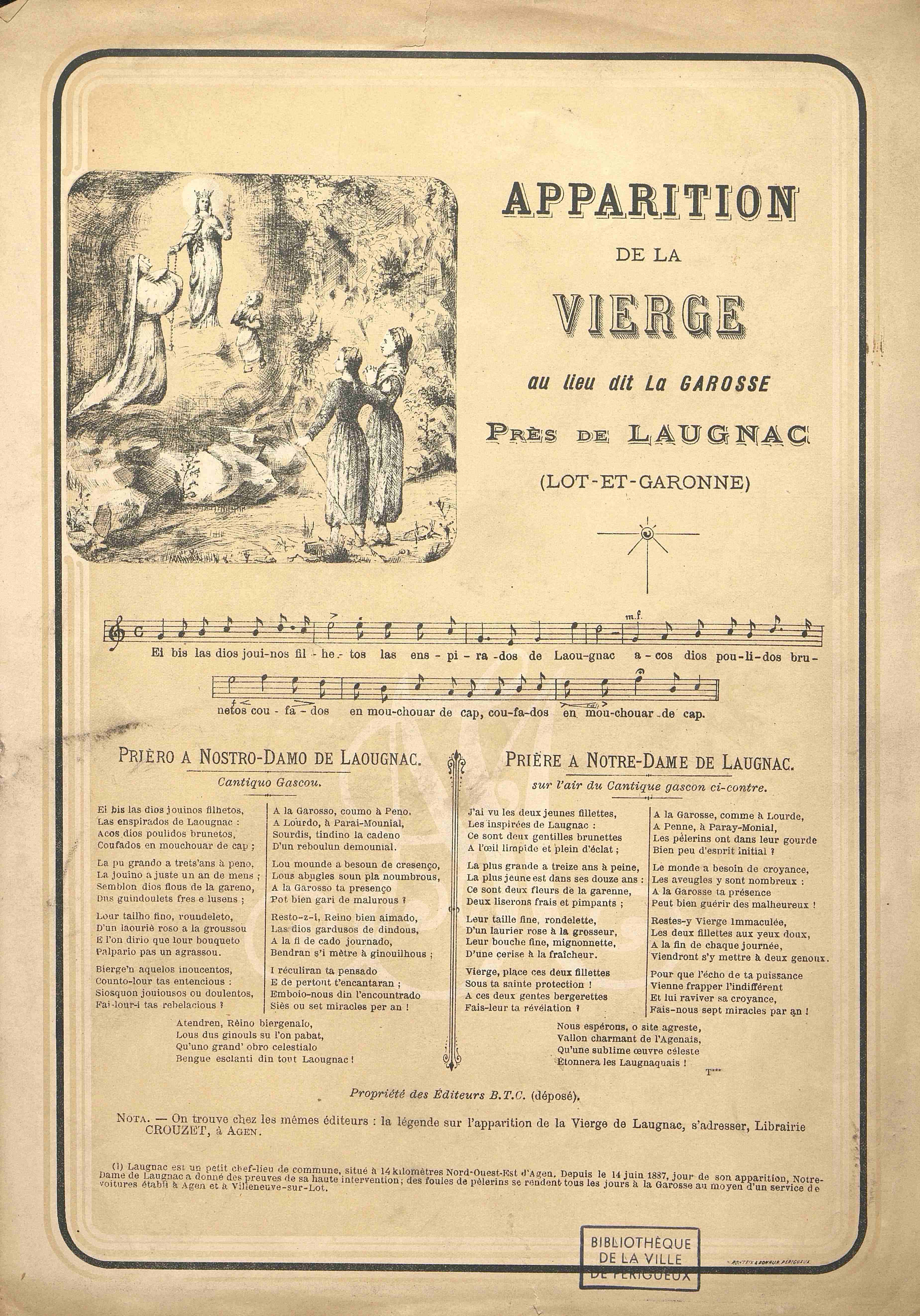 Petite affiche avec une prière bilingue Français-Occitan célébrant l'apparition de la Vierge au lieu-dit La Garosse près de Laugnac (Lot-et-Garonne).