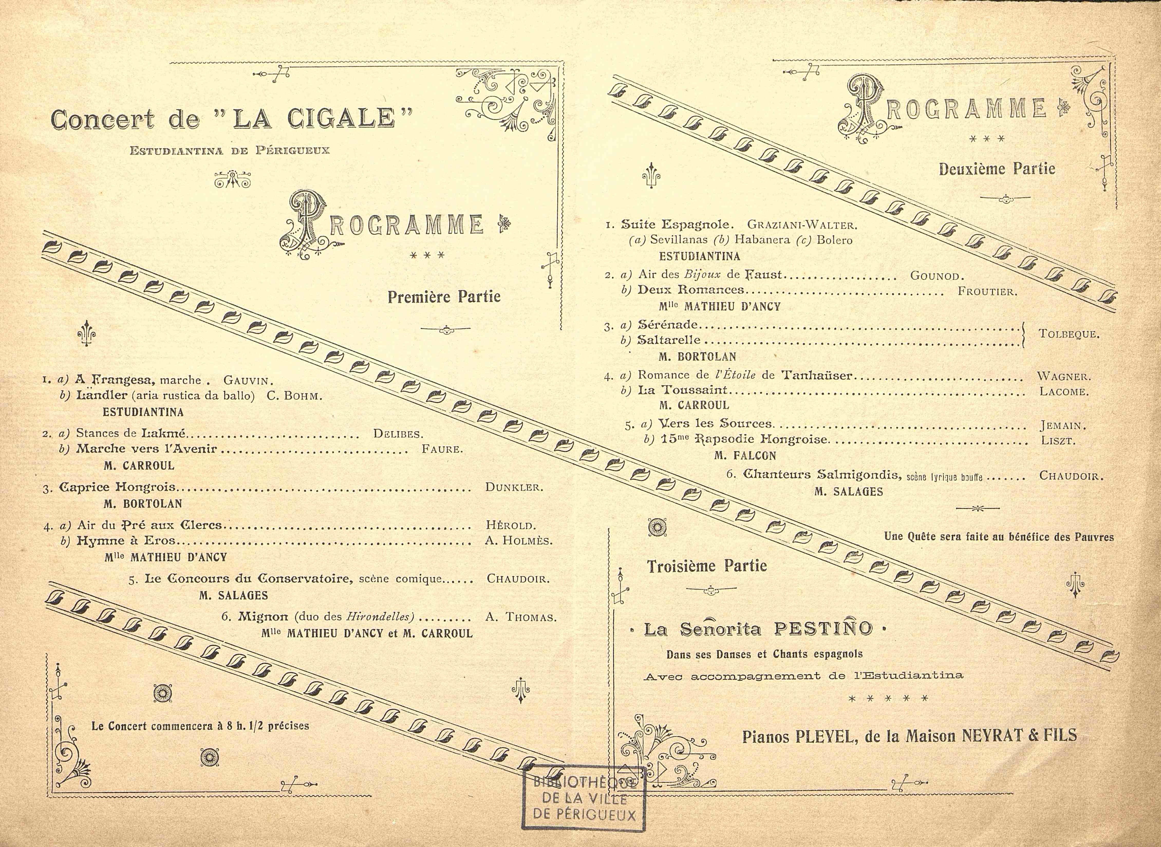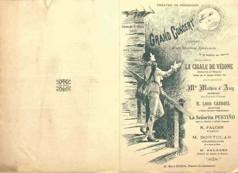 Dépliant-programme du concert du 7 mars 1903 organisé par la Cigale de Vésone au Théâtre de Périgueux.