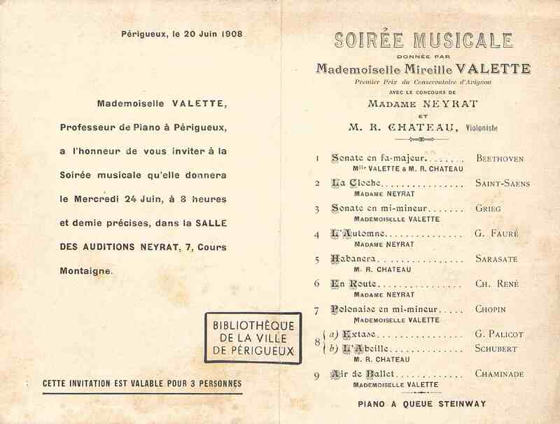 Soirée musicale donnée par Mademoiselle Mireille Valette