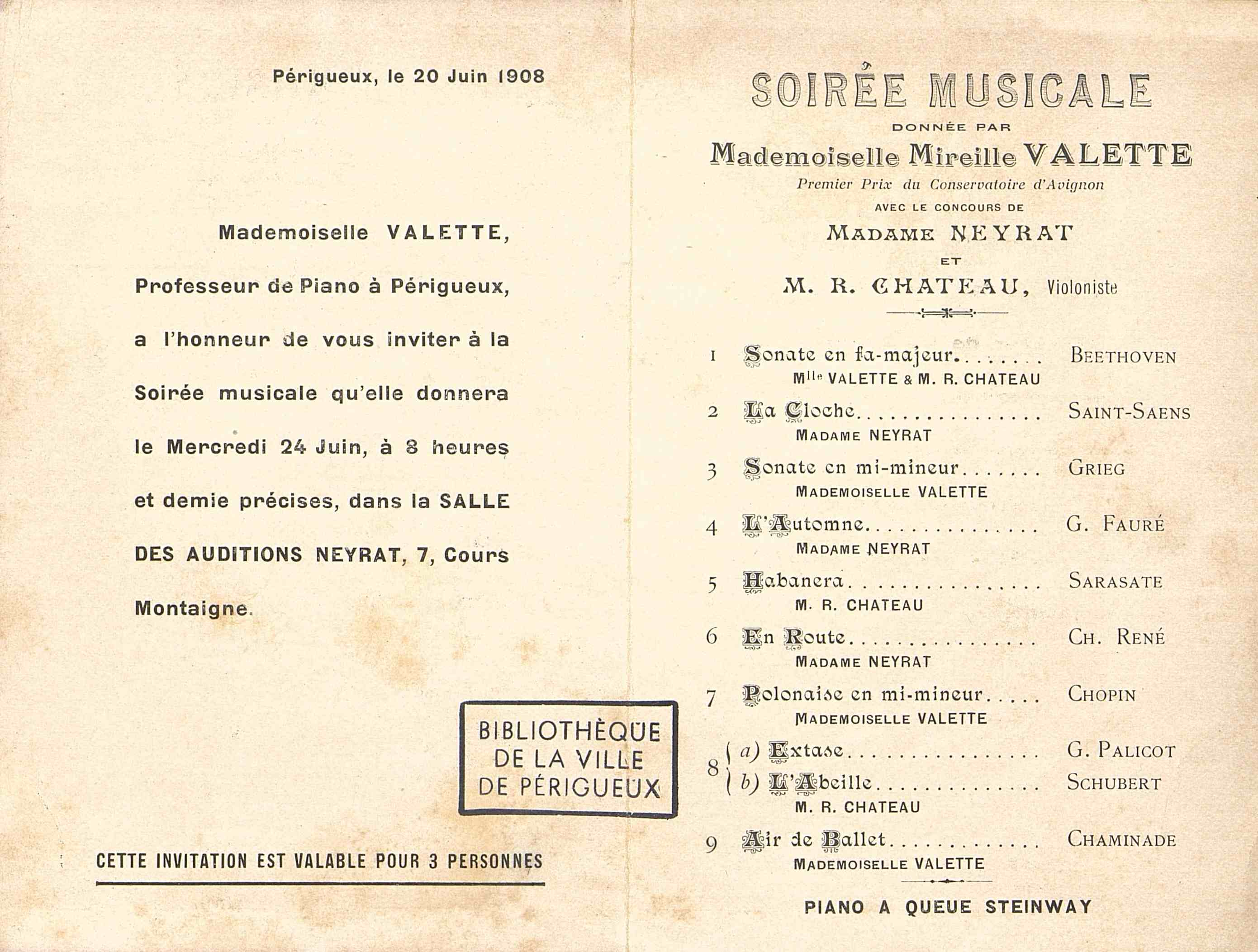 Concert de piano de Mademoiselle Mireille Valette à Périgueux, avec le concours de Madame Neyrat et M. R. Château. Publicité pour les pianos Steinway.