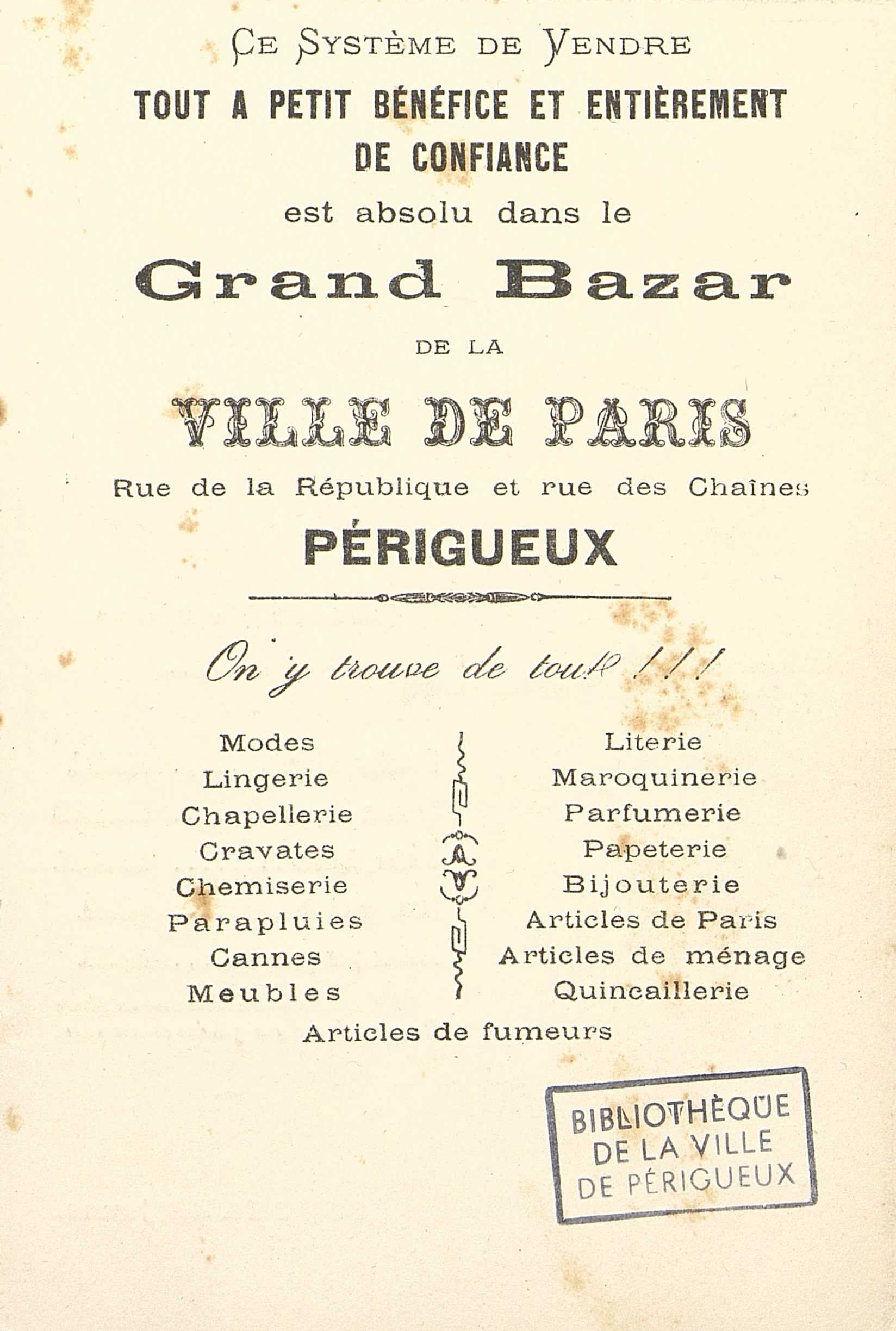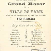 Programme de concert du 50e de Ligne. Publicité pour le Grand Bazard de la ville de Paris se situant à Périgueux.