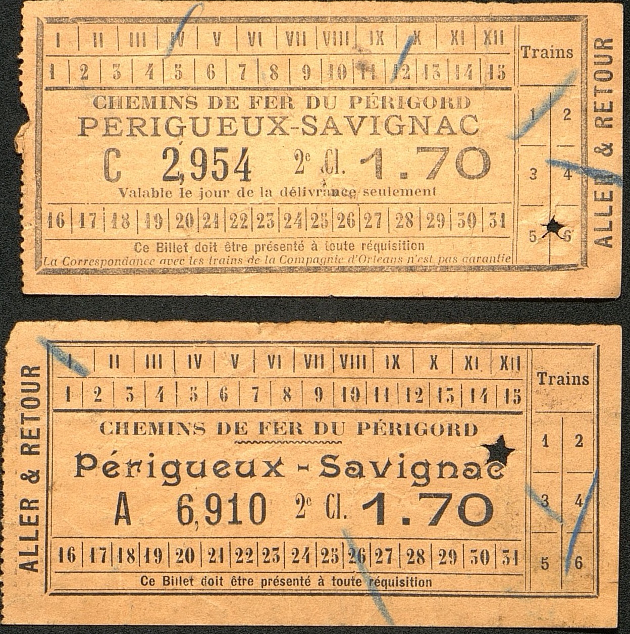 - 2 Titres de transport aller et retour de Périgueux à Savignac. Nombreuses marques bleues sur ces tickets.