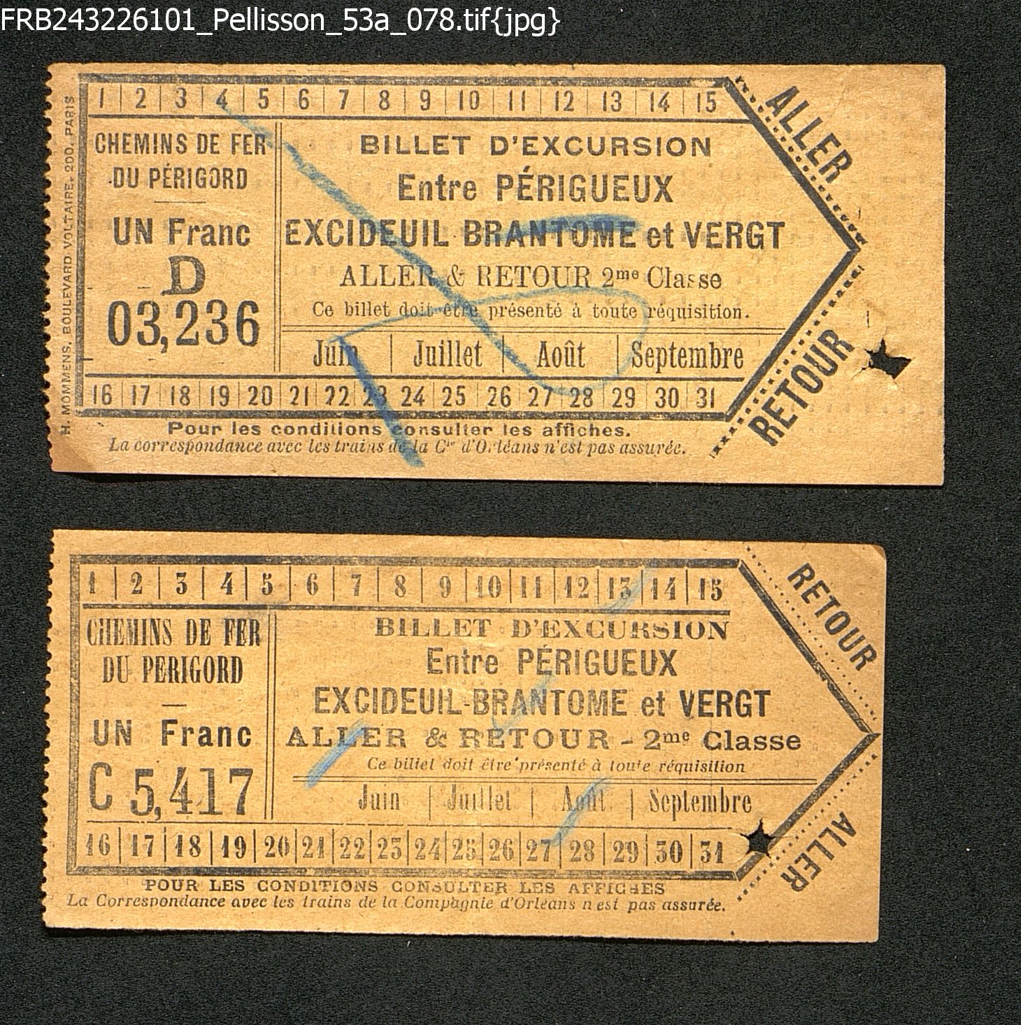 1 billet aller, l'autre retour entre Périgueux, Excideuil, Brantôme et Vergt.