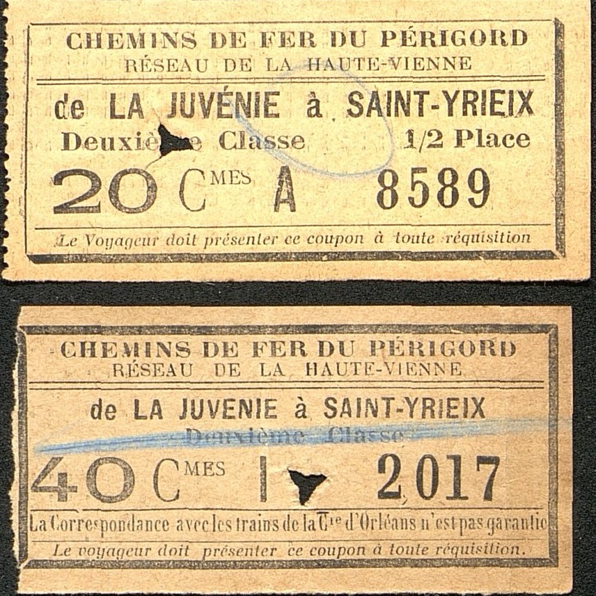 2 billets : de La Juvénie à Saint-Yrieix. Chemins de Fer du Périgord, Réseau de la Haute-Vienne.