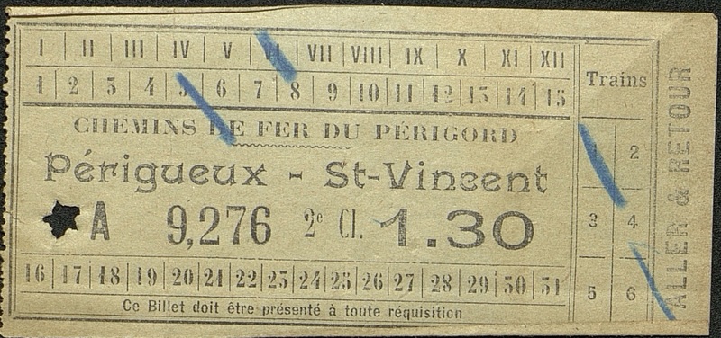Ticket aller-retour : Périgueux-St-Vincent, par les Chemins de Fer du Périgord. Traces de lignes au crayon bleu sur ce ticket.