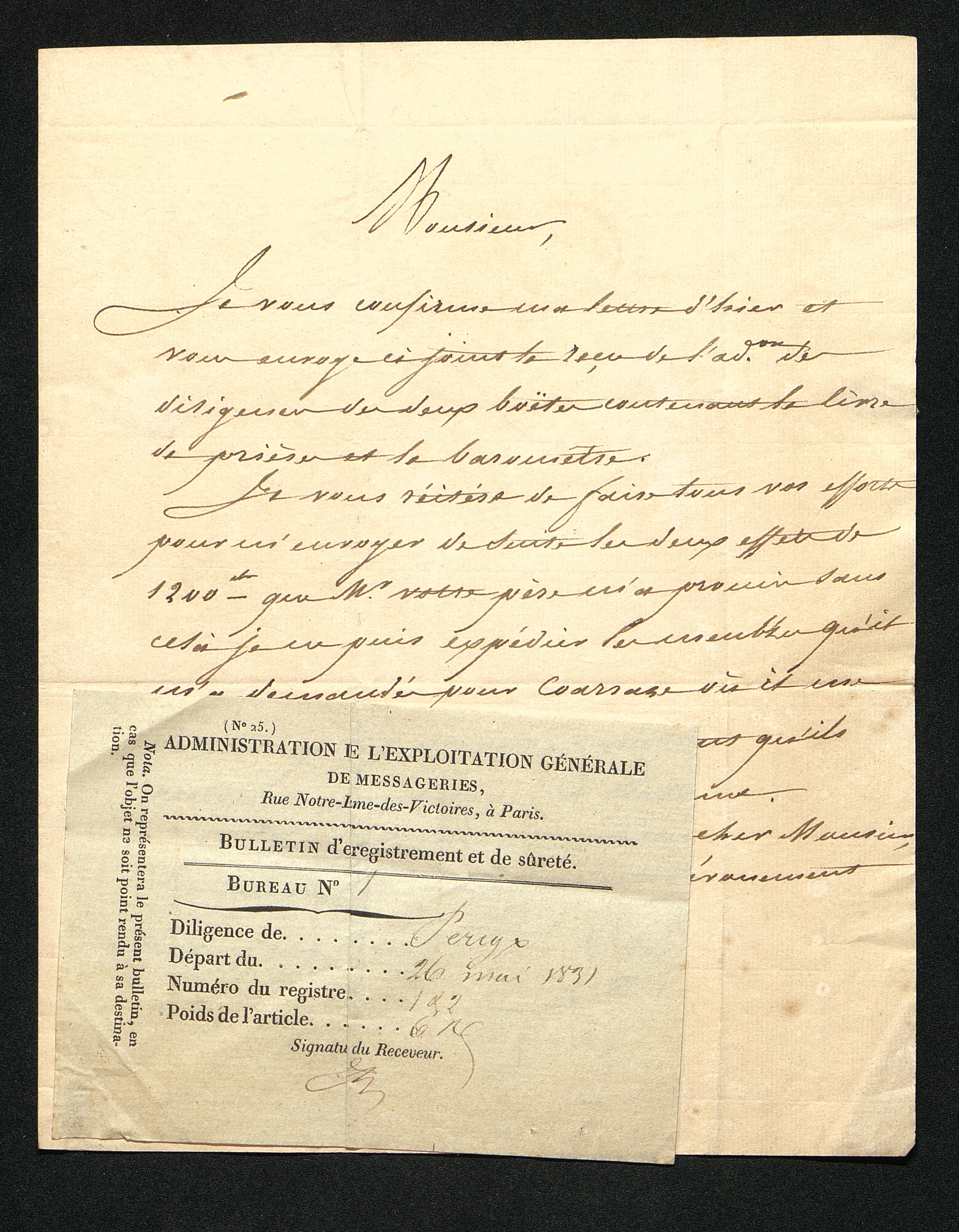 Lettre et reçu des Messageries