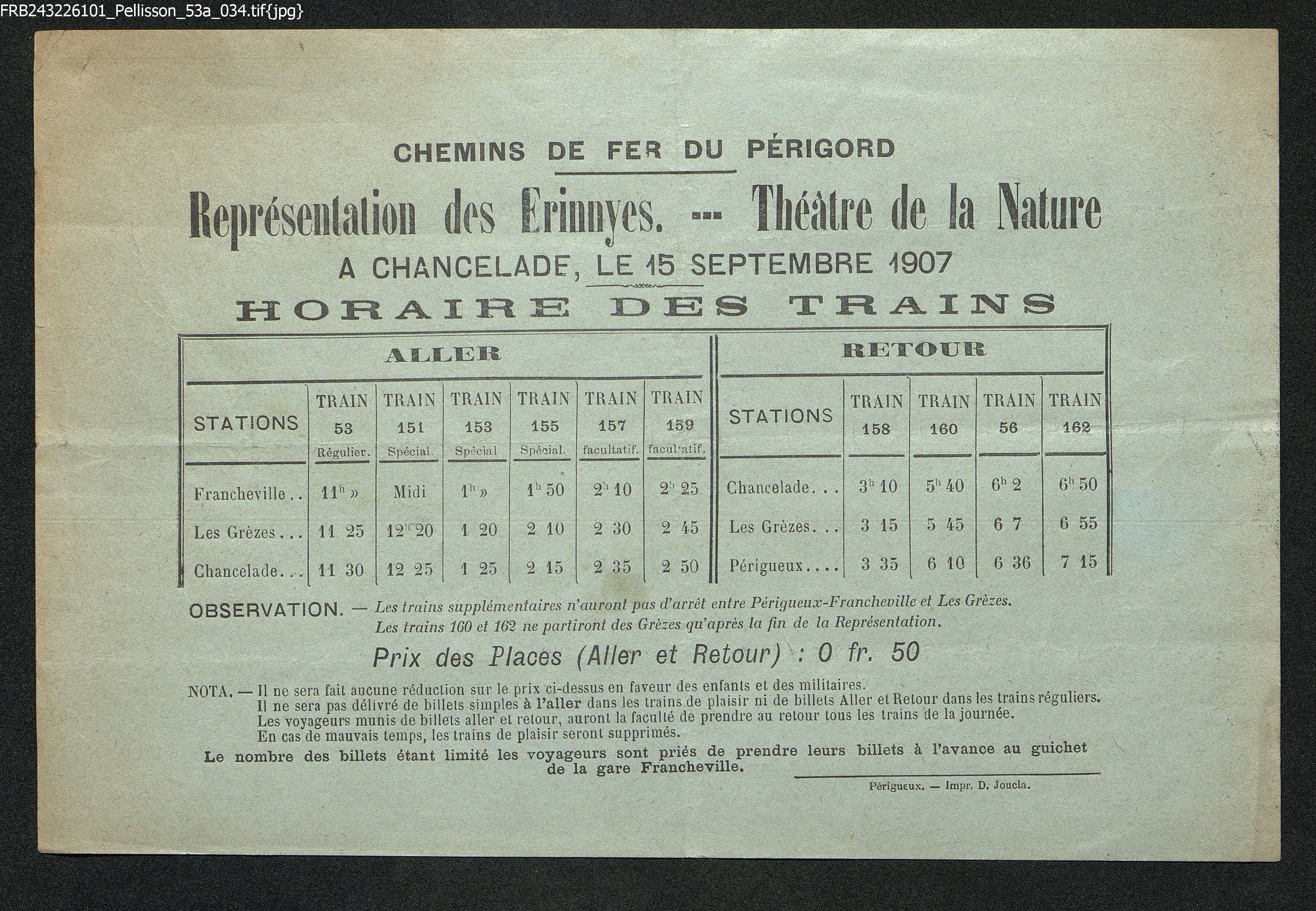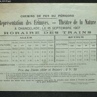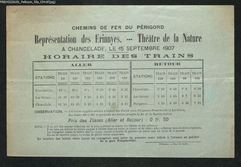 Représentation des Erinnyes au Théâtre de la Nature à Chancelade. Horaires des trains qui y conduisent pour la représentation du 15 septembre 1907.