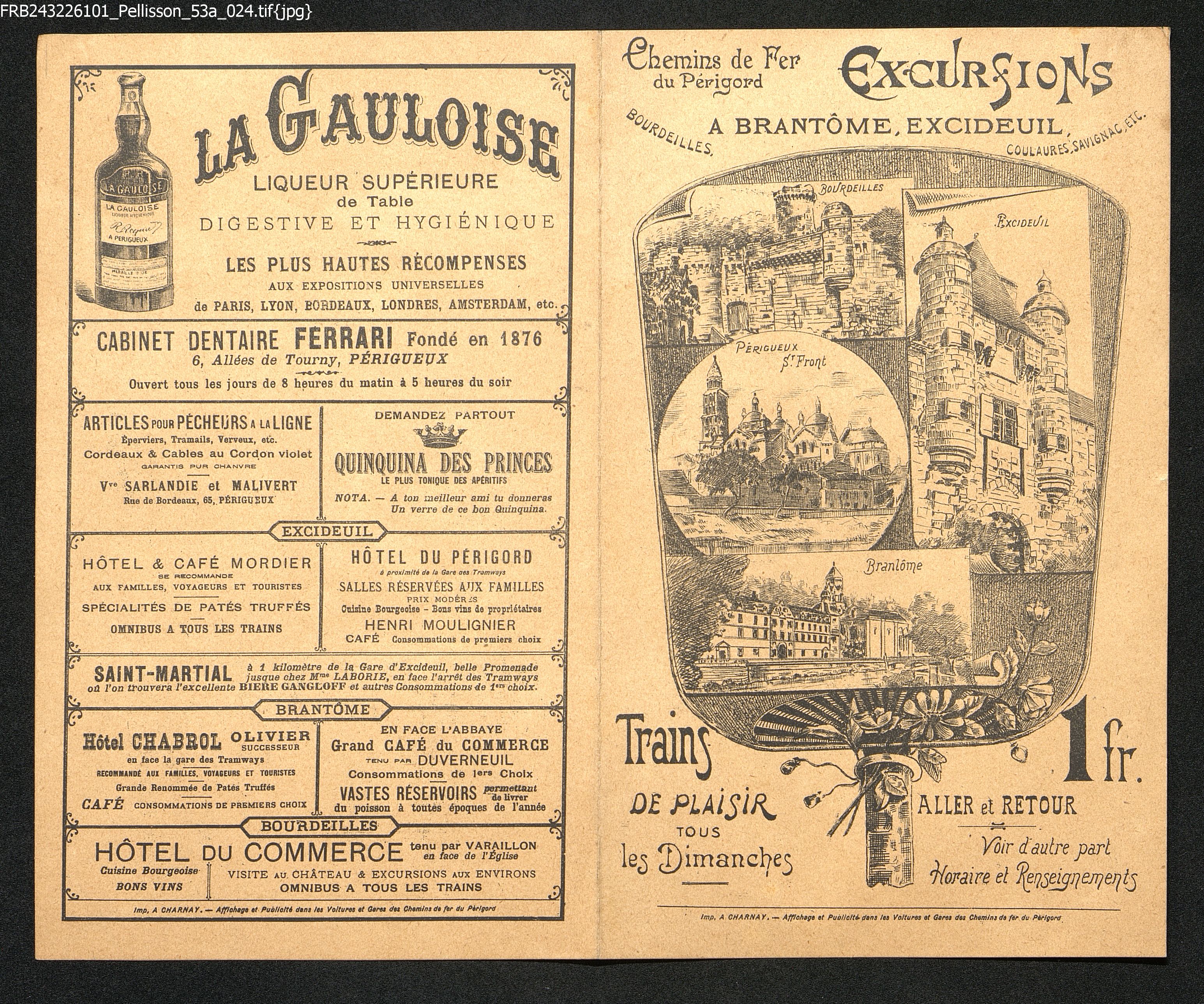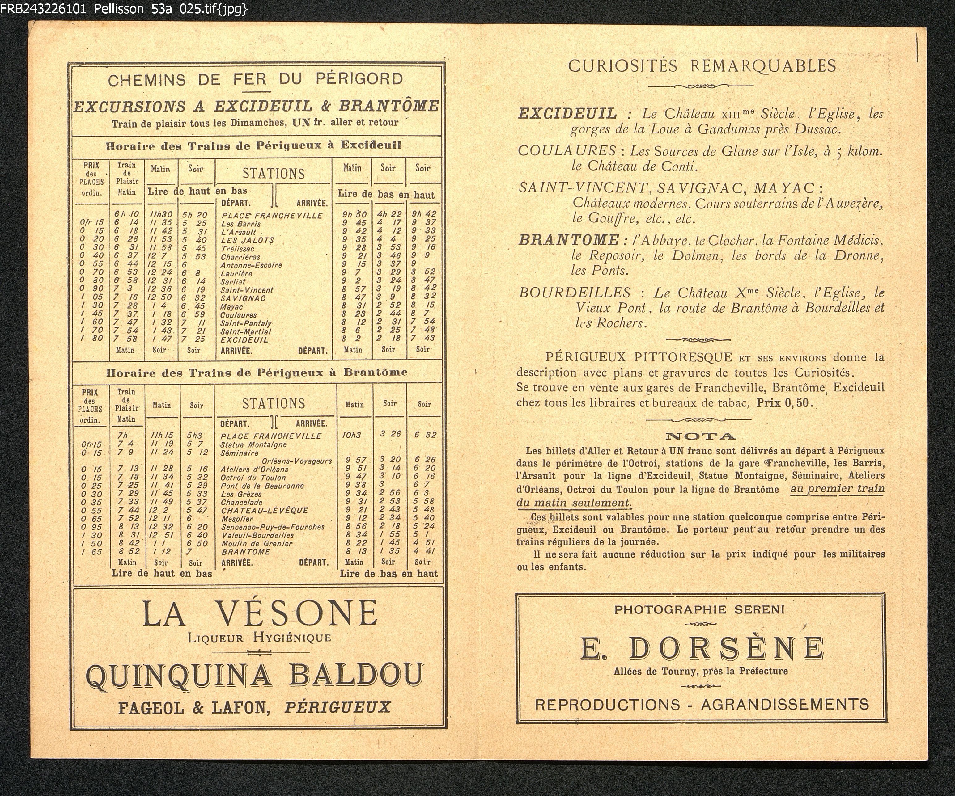 Chemins de fer du Périgord. Trains de plaisir.Excursions à Brantôme, Excideuil.