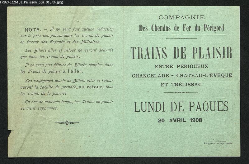 Chemins de fer du Périgord. Trains de plaisir. Lundi de Pâques