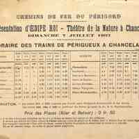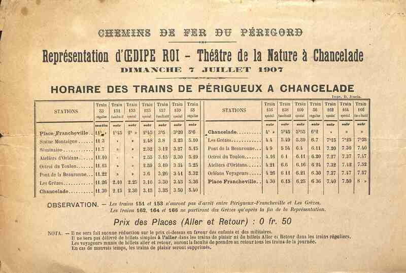 Affichette des horaires de train pour assister à une représentation théâtrale d'Œdipe roi au Théâtre nature à Chancelade.