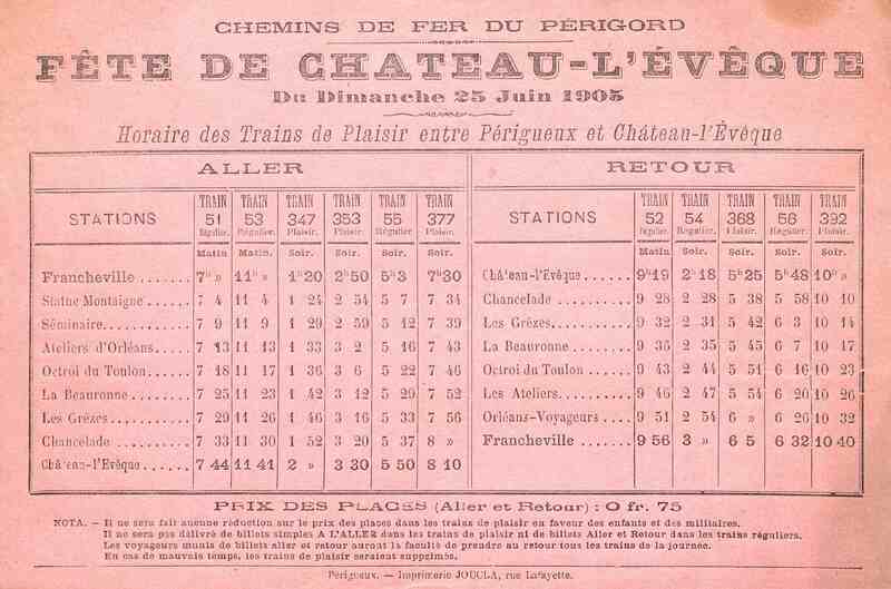 Chemins de fer du Périgord. Trains de plaisir. Fête de Château-L'Evêque.