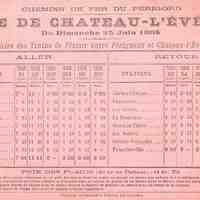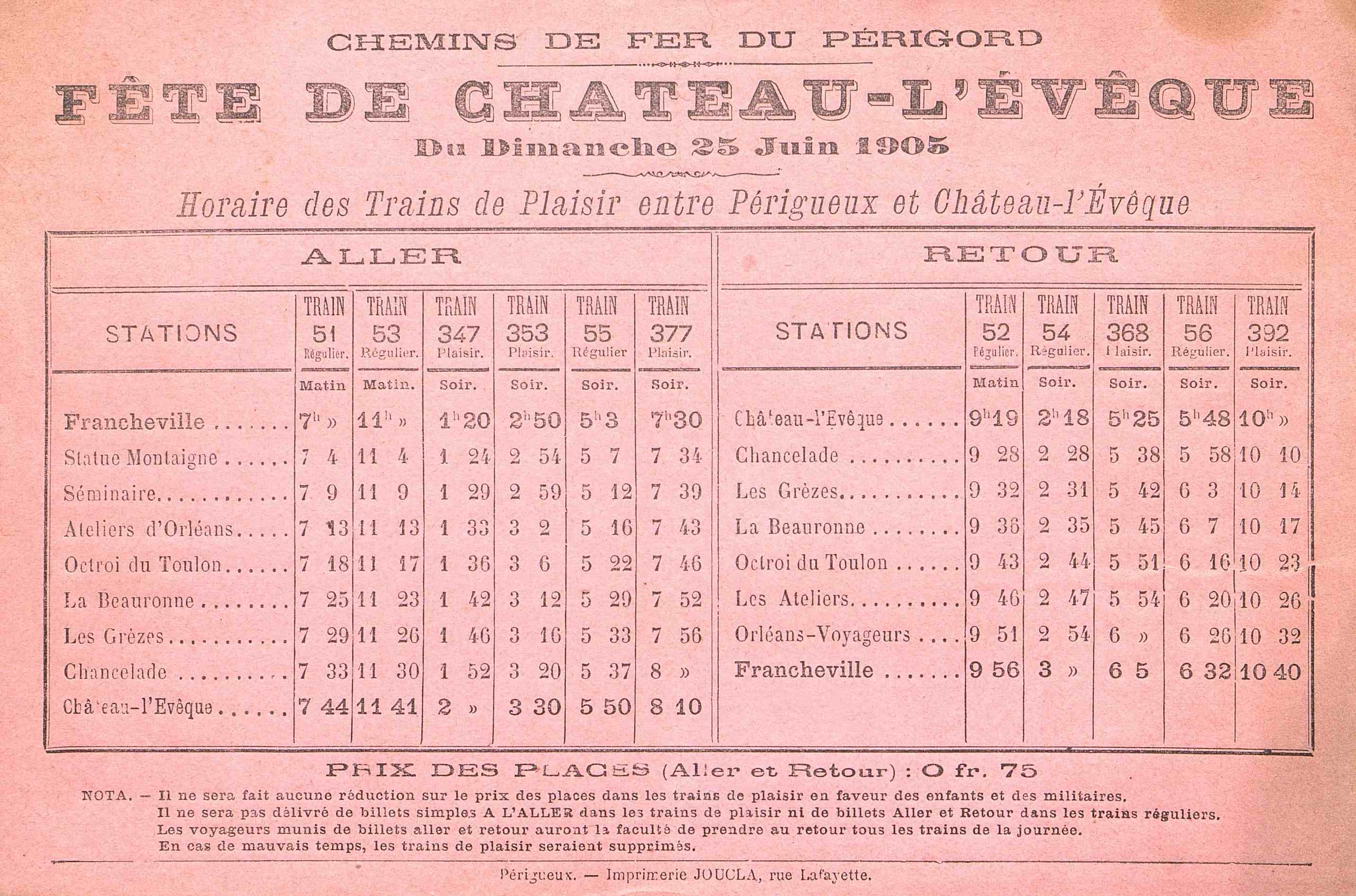 Affichette des horaires et tarifs des Chemins de fer du Périgord. Trains de plaisir à l'occasion de la Fête de Château-L'Evêque.