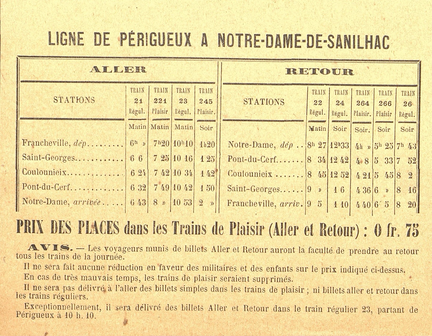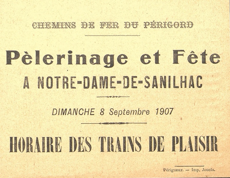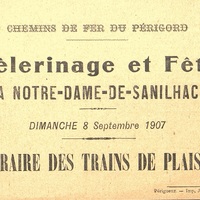 - Chemins de fer du Périgord. Pèlerinage et fête à Notre-Dame-de-Sanilhac. Au dos les horaires et les modalités.