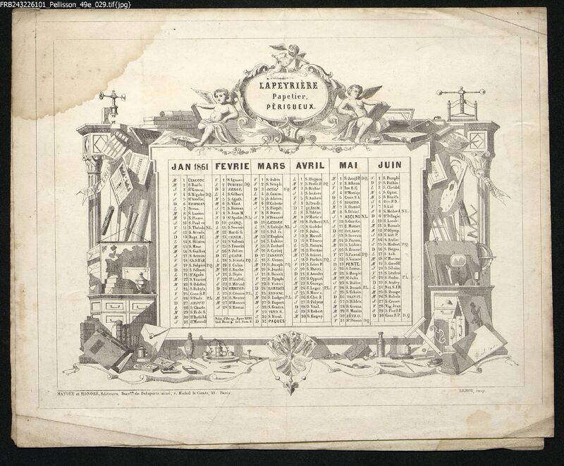 Calendrier publicitaire, 1861, verso.