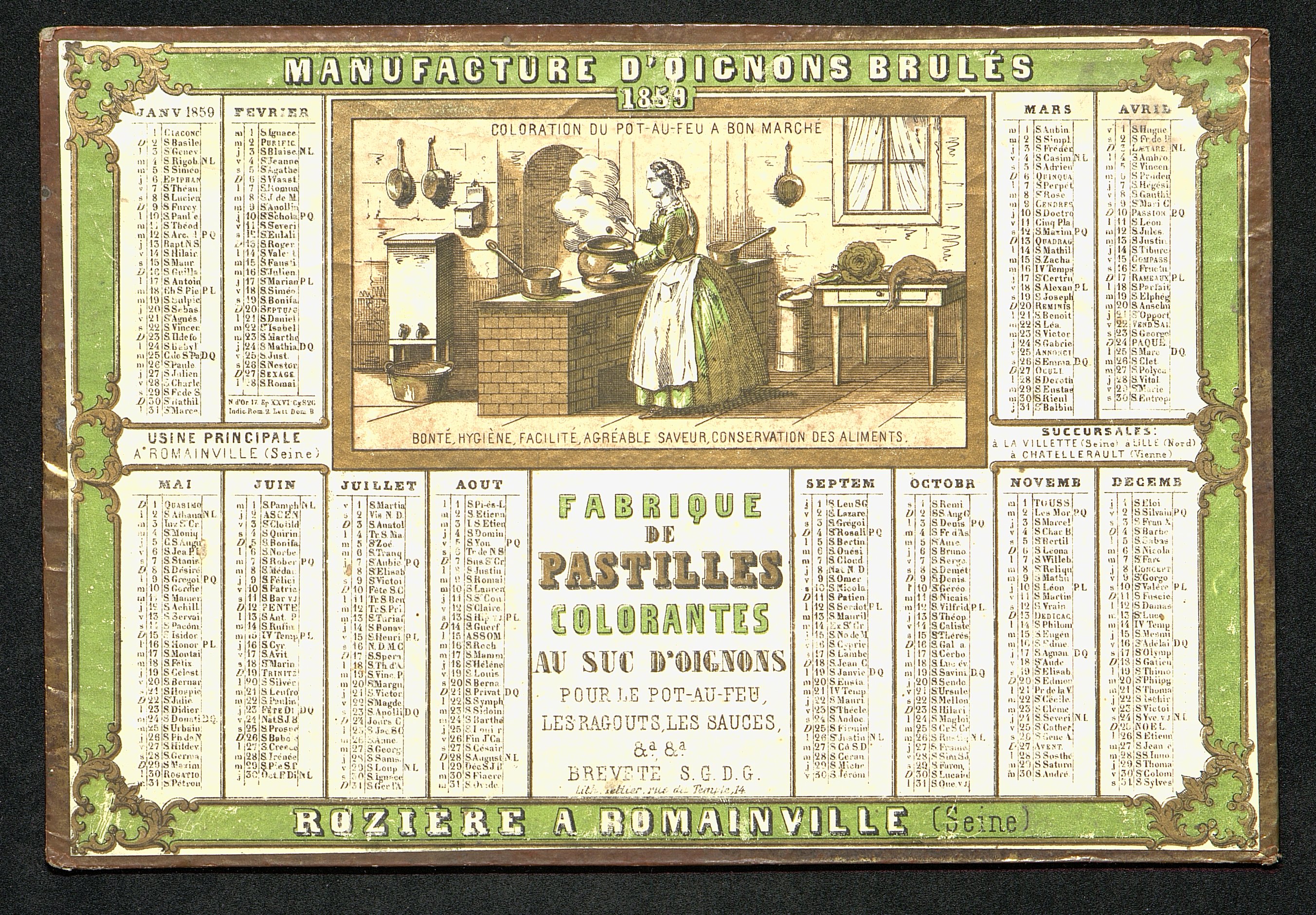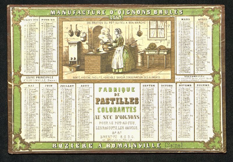 Calendrier de la Maison Rozière à Romainville pour l'année 1859. Au dos une publicité pour cette même maison commerciale.