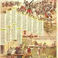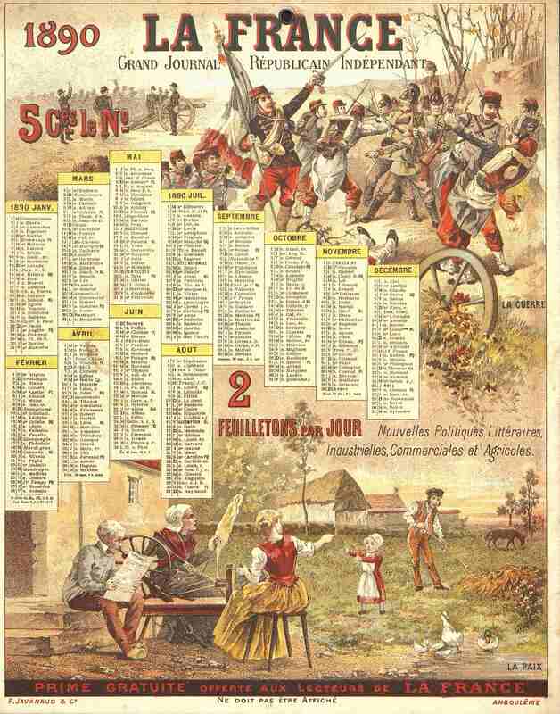Calendrier publicitaire pour La France, grand journal républicain indépendant. Année 1890, illustré de deux thèmes : La paix et la Guerre.