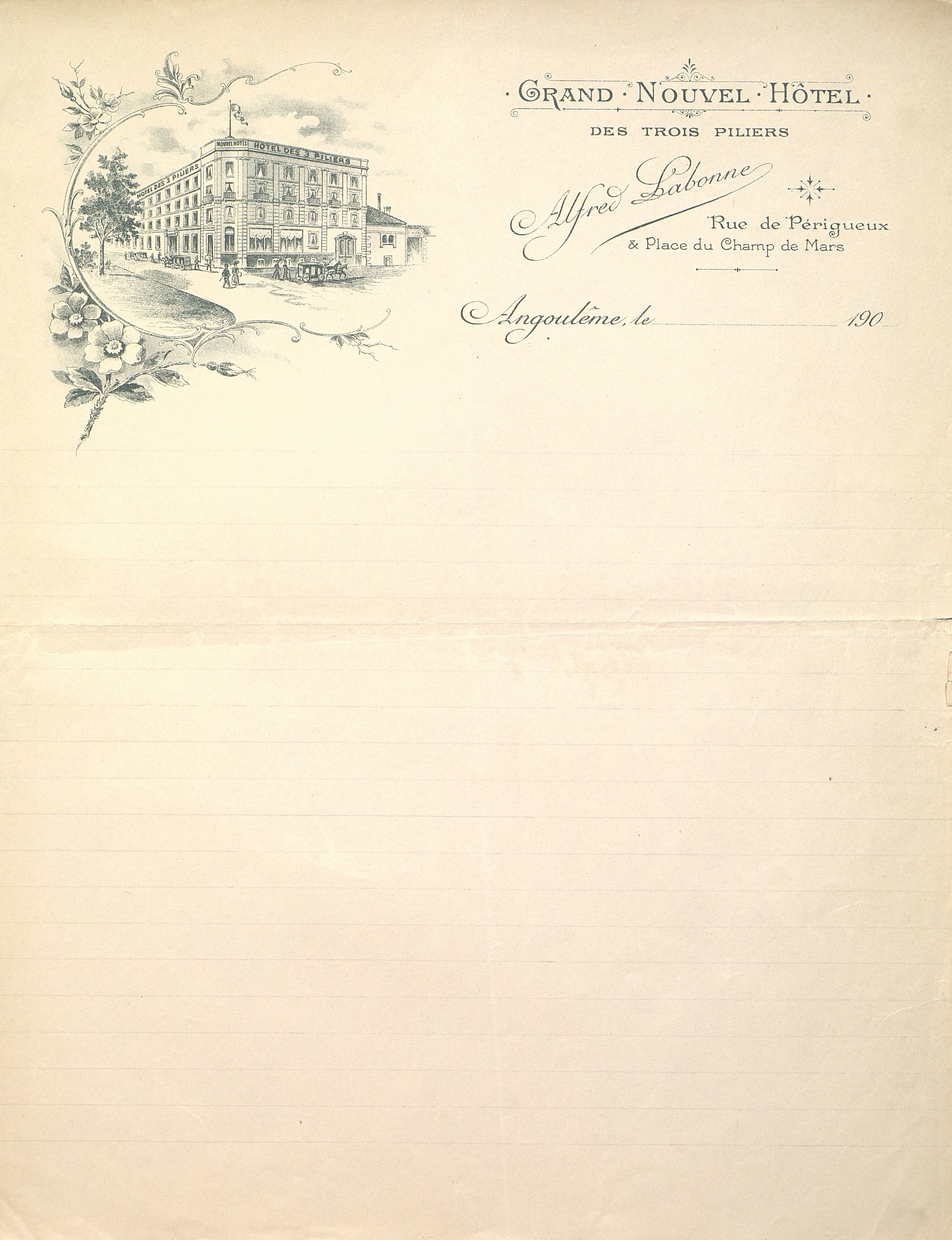 - Entête du Grand Nouvel Hôtel des Trois Piliers à Angoulême