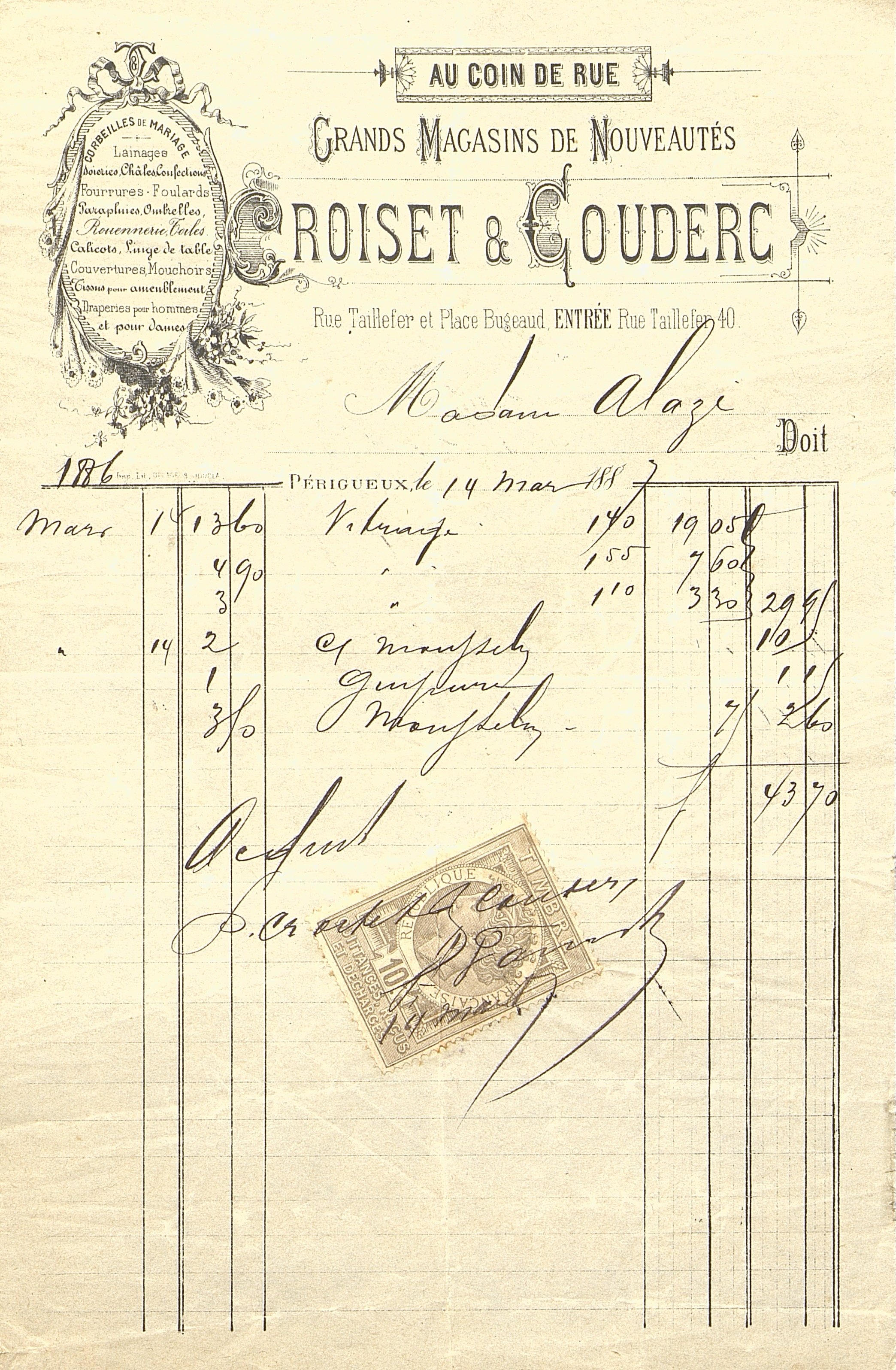 Facture de la Maison Croiset et Couderc. Imprimé avec de nombreuses mentions manuscrites. Un timbre est présent sur la facture.