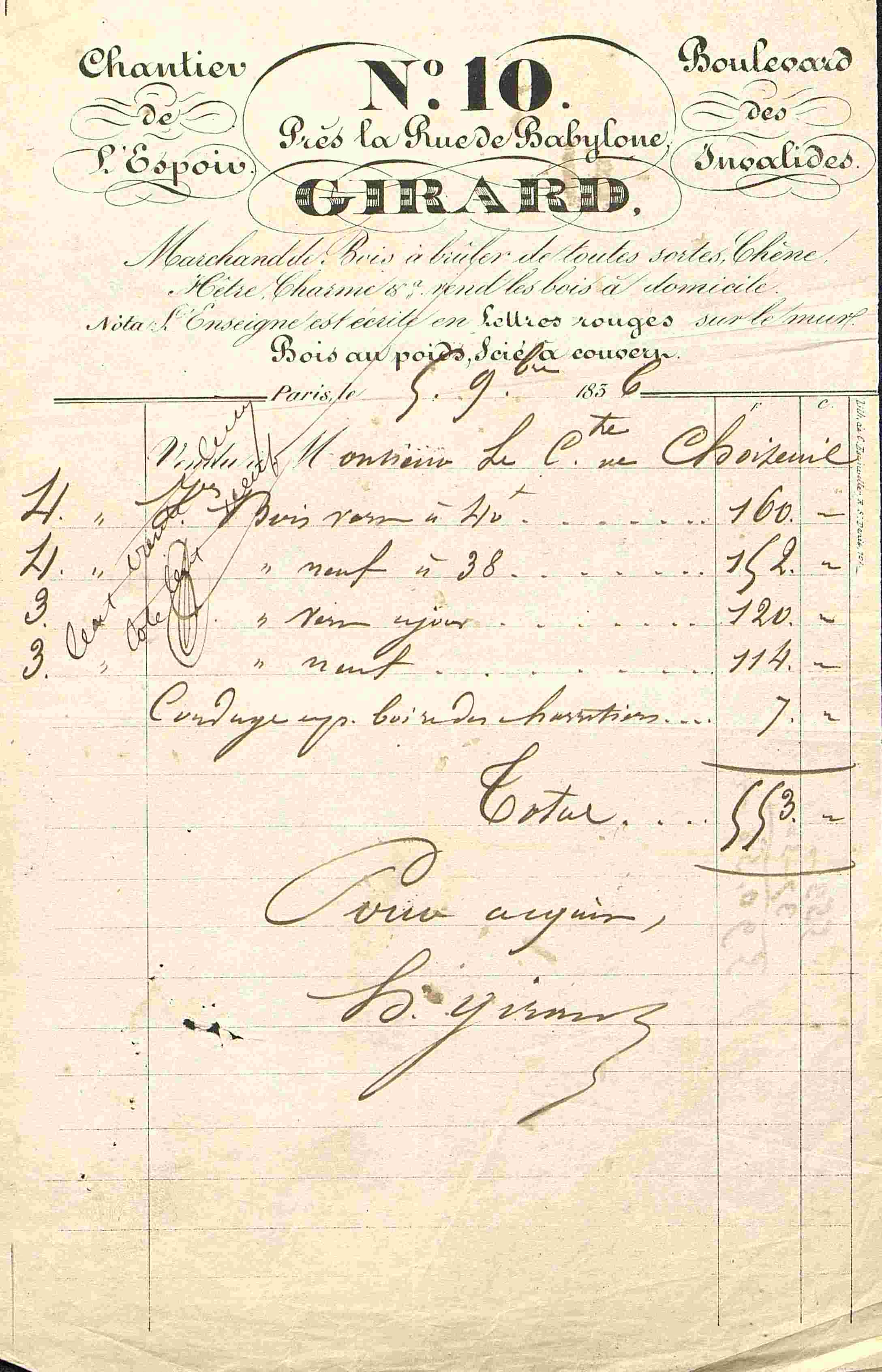 Facture de Girard, Marchand de bois et combustibles à Paris. Imprimé sur lequel sont portés des mentions manuscrites.
