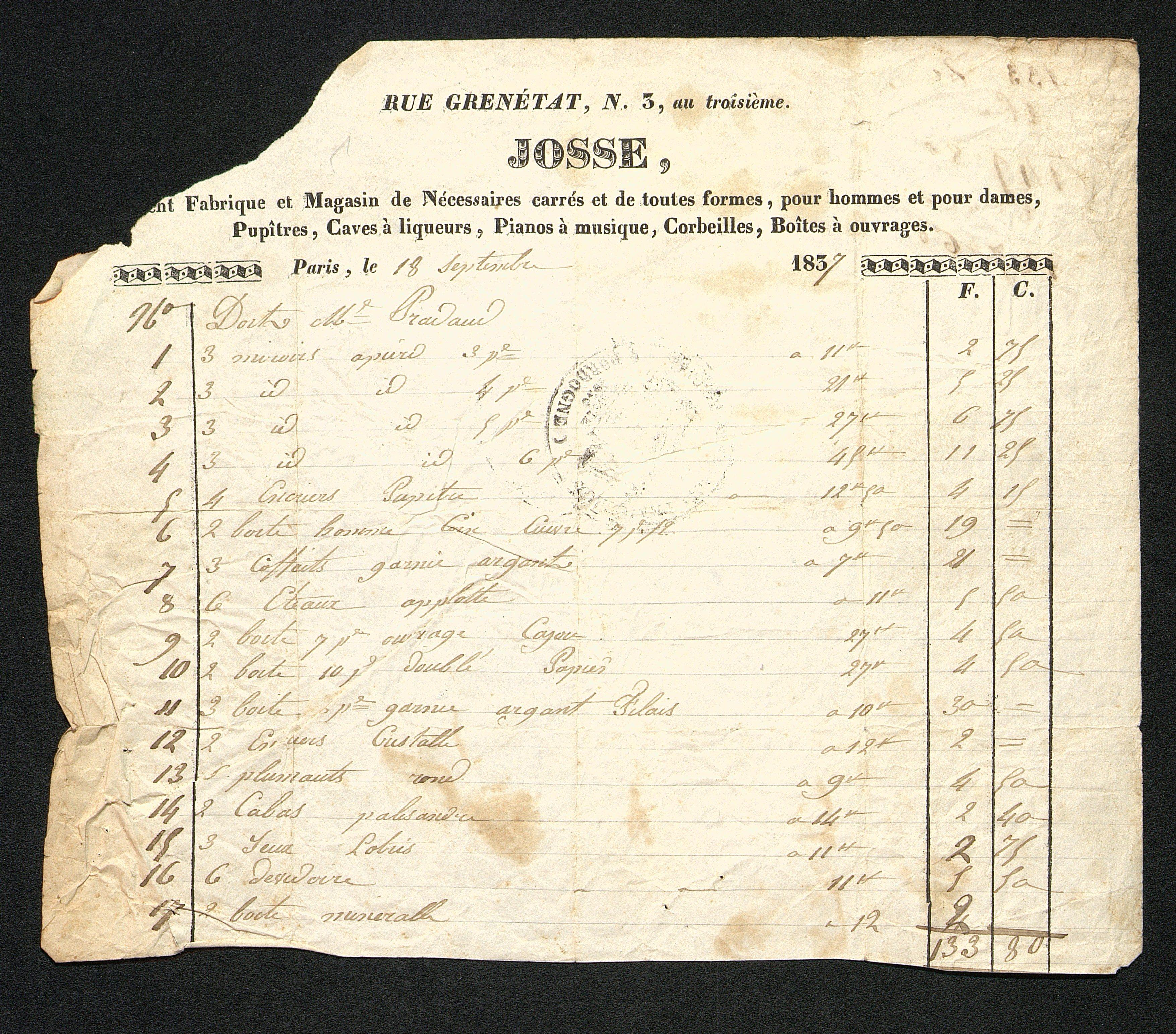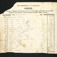 Facture en mauvais état, pré-imprimée et remplie de manière manuscrite. Magasin de nécessaires carrés et de toutes formes.