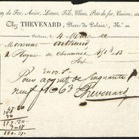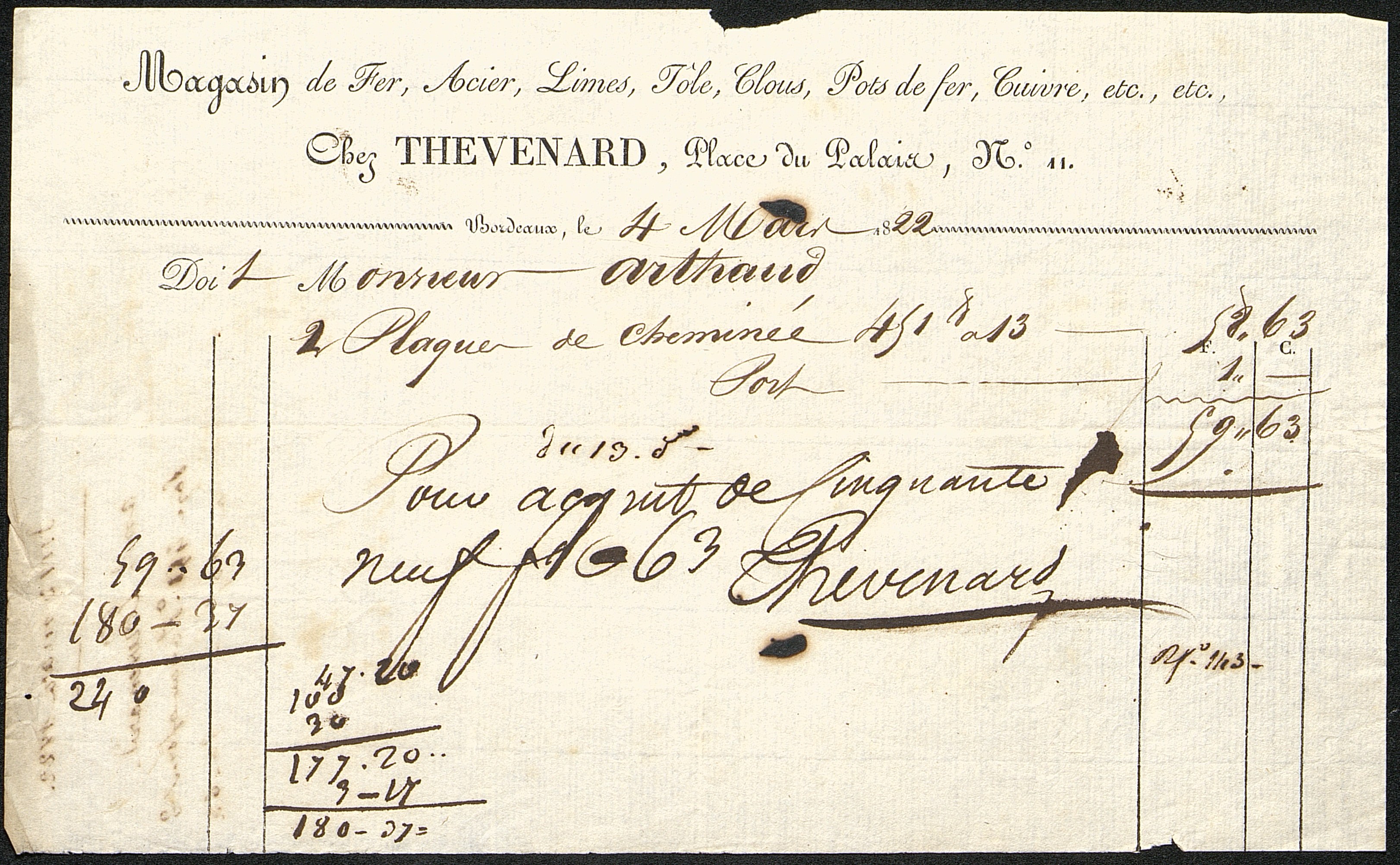 Chez Thévenard,, marchand d'outillage, quincaillerie à Bordeaux. Facture manuscrite sur imprimé, adressée à M. Arthaud, avec notes de comptabilités.