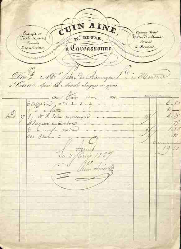 Facture de M. Cuin aîné, marchand de ferMarchand de fer à Carcassonne. Manuscrit sur imprimé. Facture sur une commande de juin 1837, payée en février 1837.