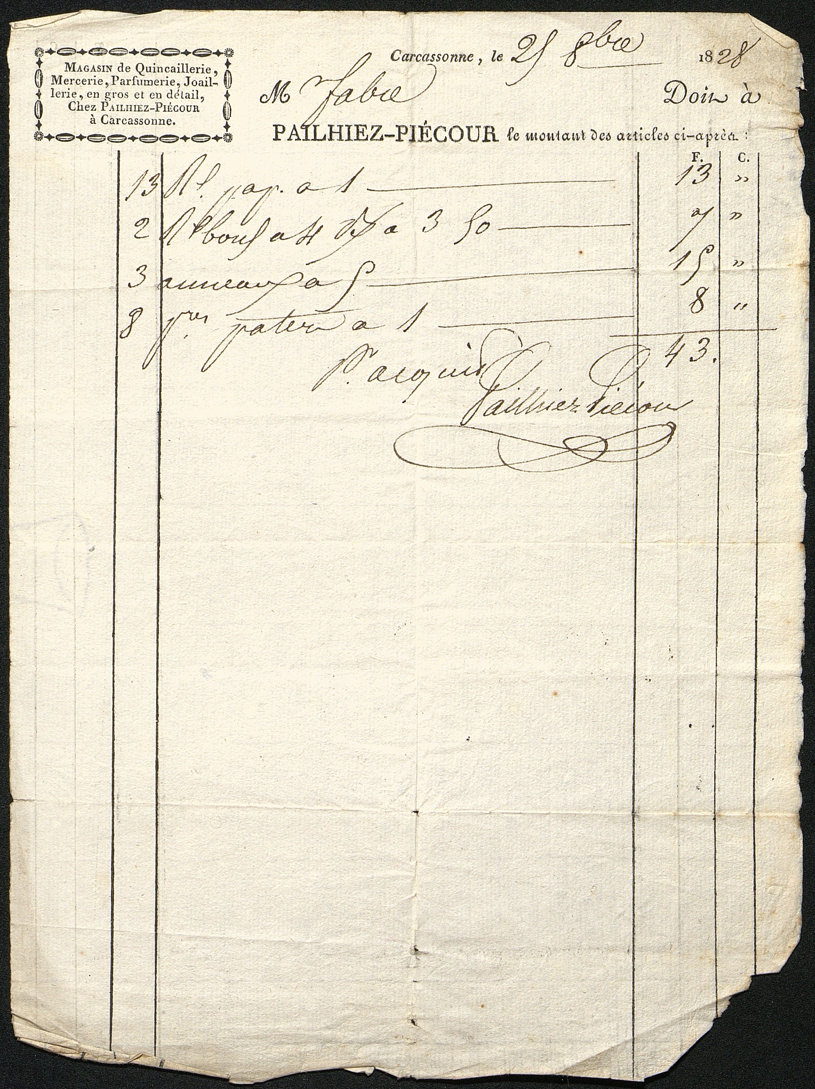 Facture manuscrite sur imprimé de la Quincaillerie Pailhiez-Piécour à Carcassonne.