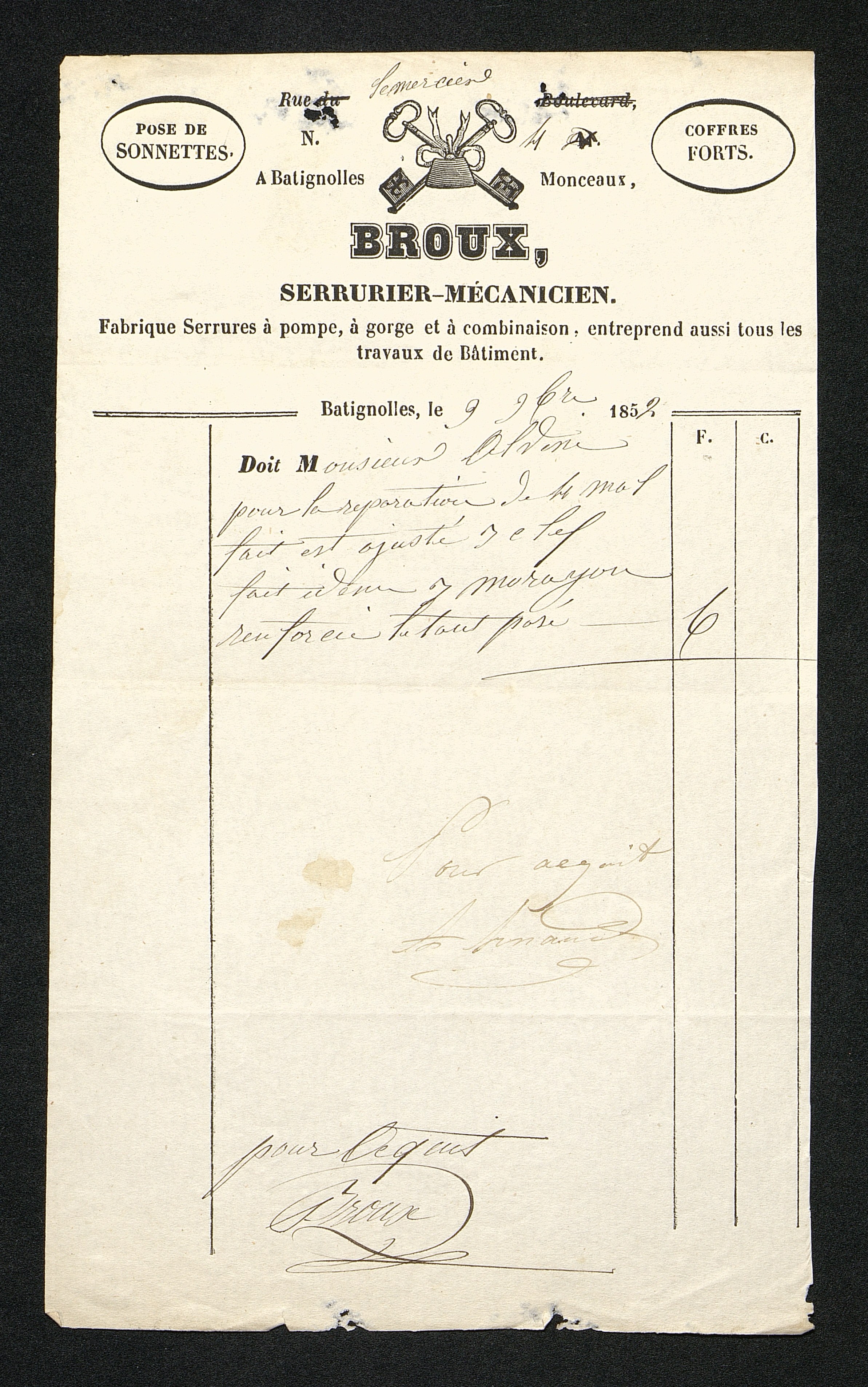 Faccture manuscrite sur imprimé de M. Broux,Serrurier-mécanicien aux Batignolles.