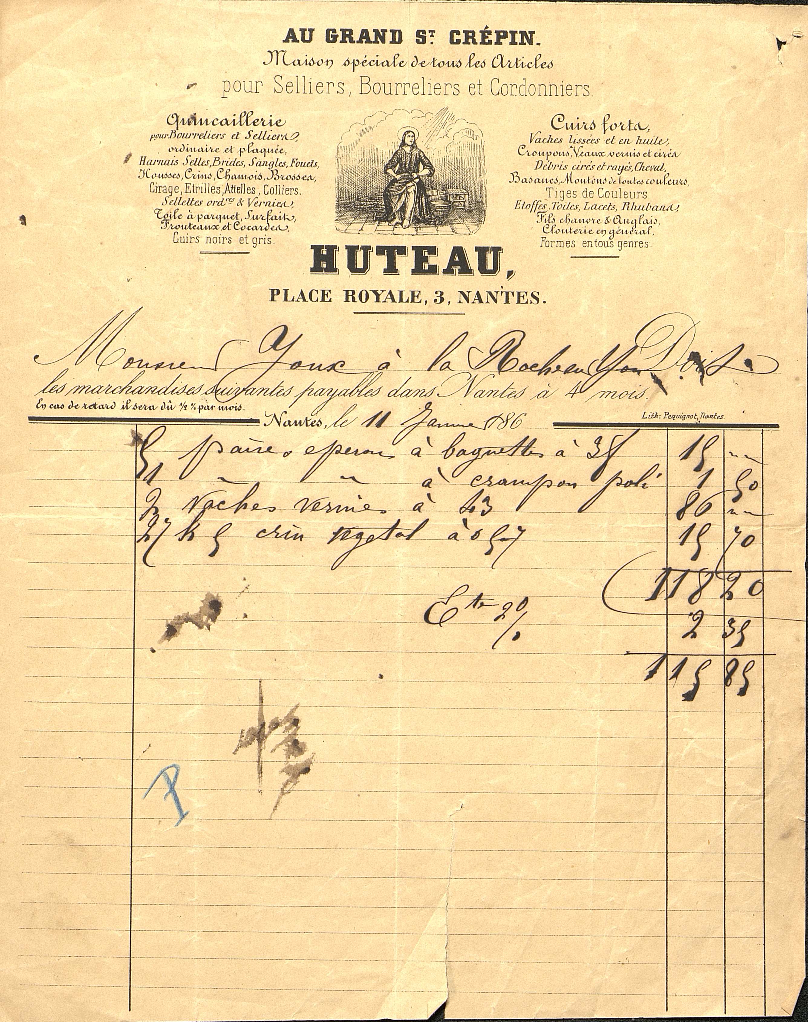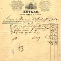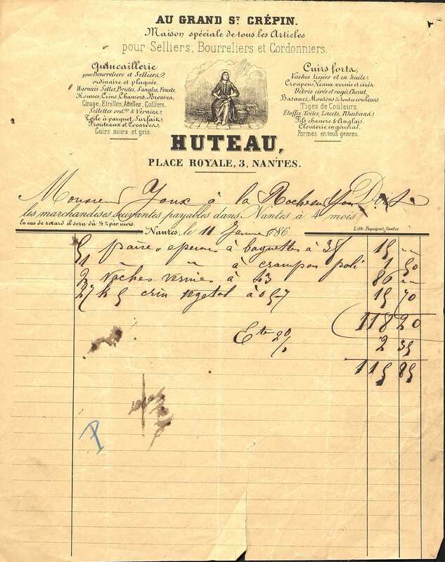 Articles pour selliers, bourreliers et cordonniers. Huteau, place Royale à Nantes. Facture manuscrite sur imprimé adressée à M. Joux