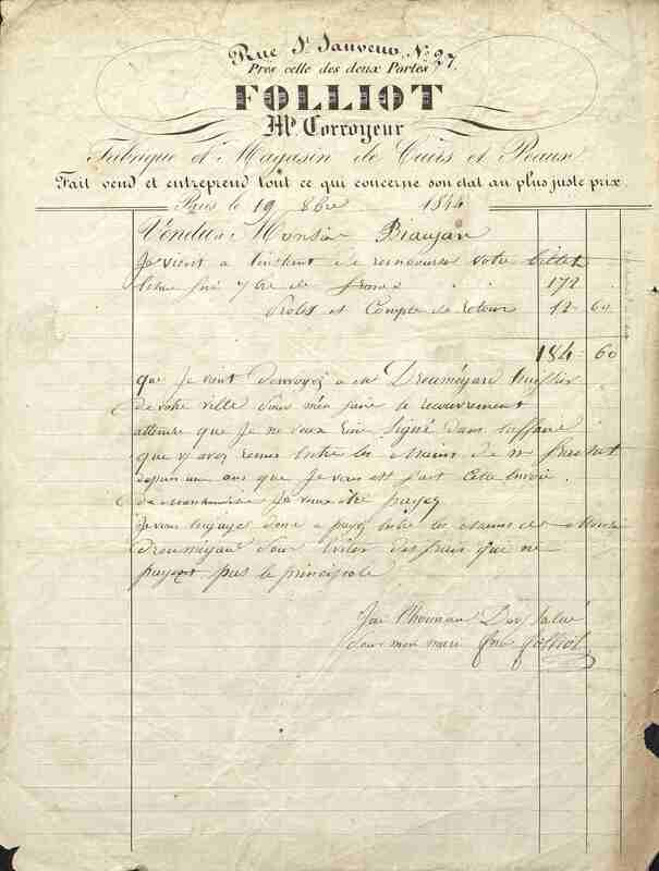 Lettre de reconnaissance du corroyeur Folliot à Paris au bottier Biaujand à Périgueux. Document illustré et imprimé rempli en écriture manuscrite.