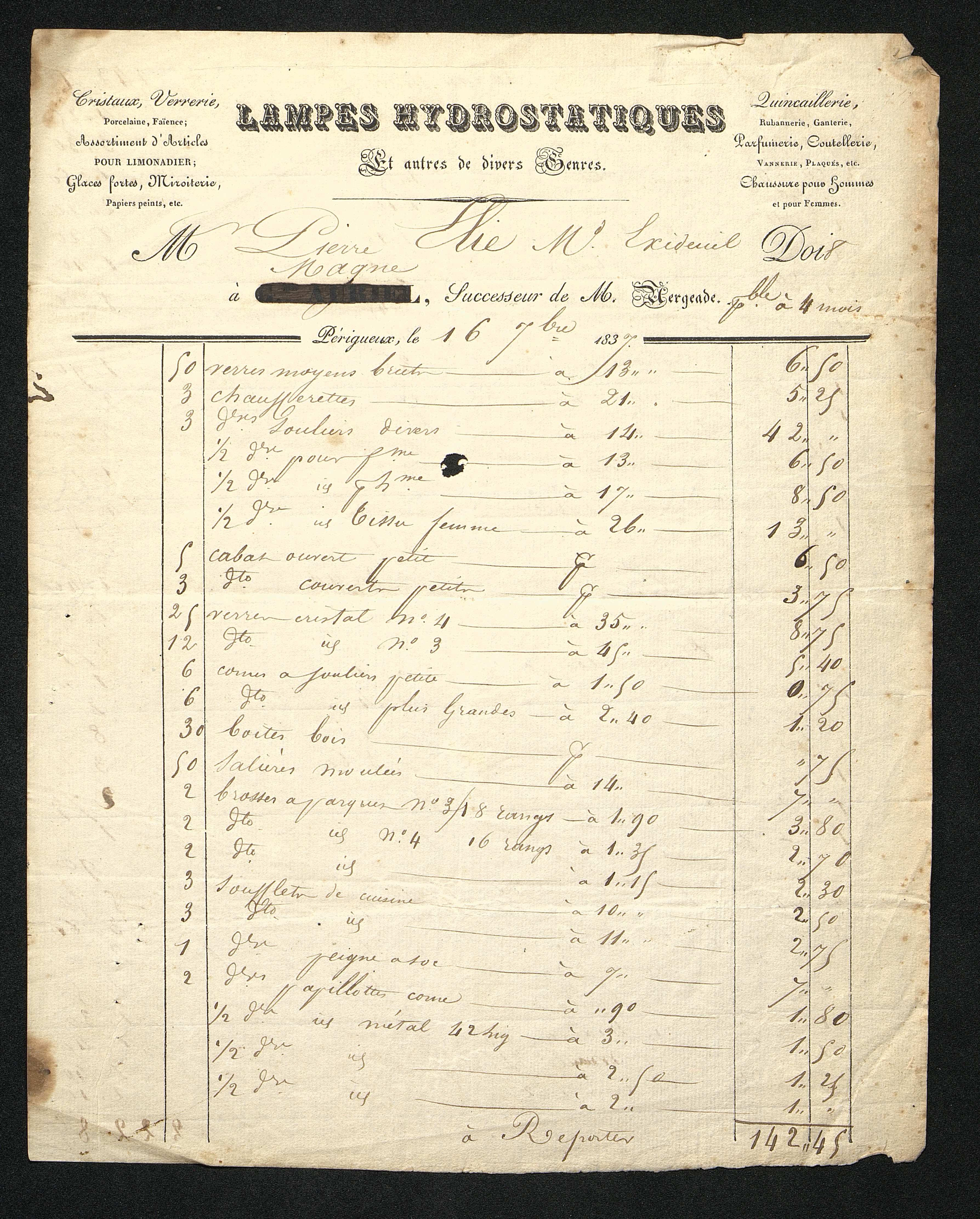Lettre-facture de l'entreprise de Lampes Hydrostatiques, Quincaillerie, verres, cristaux. Pré-imprimé avec mentions manuscrites. Effacement d'un nom à l'encre noire.