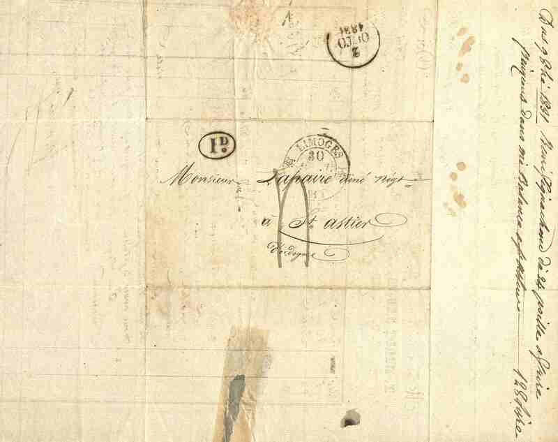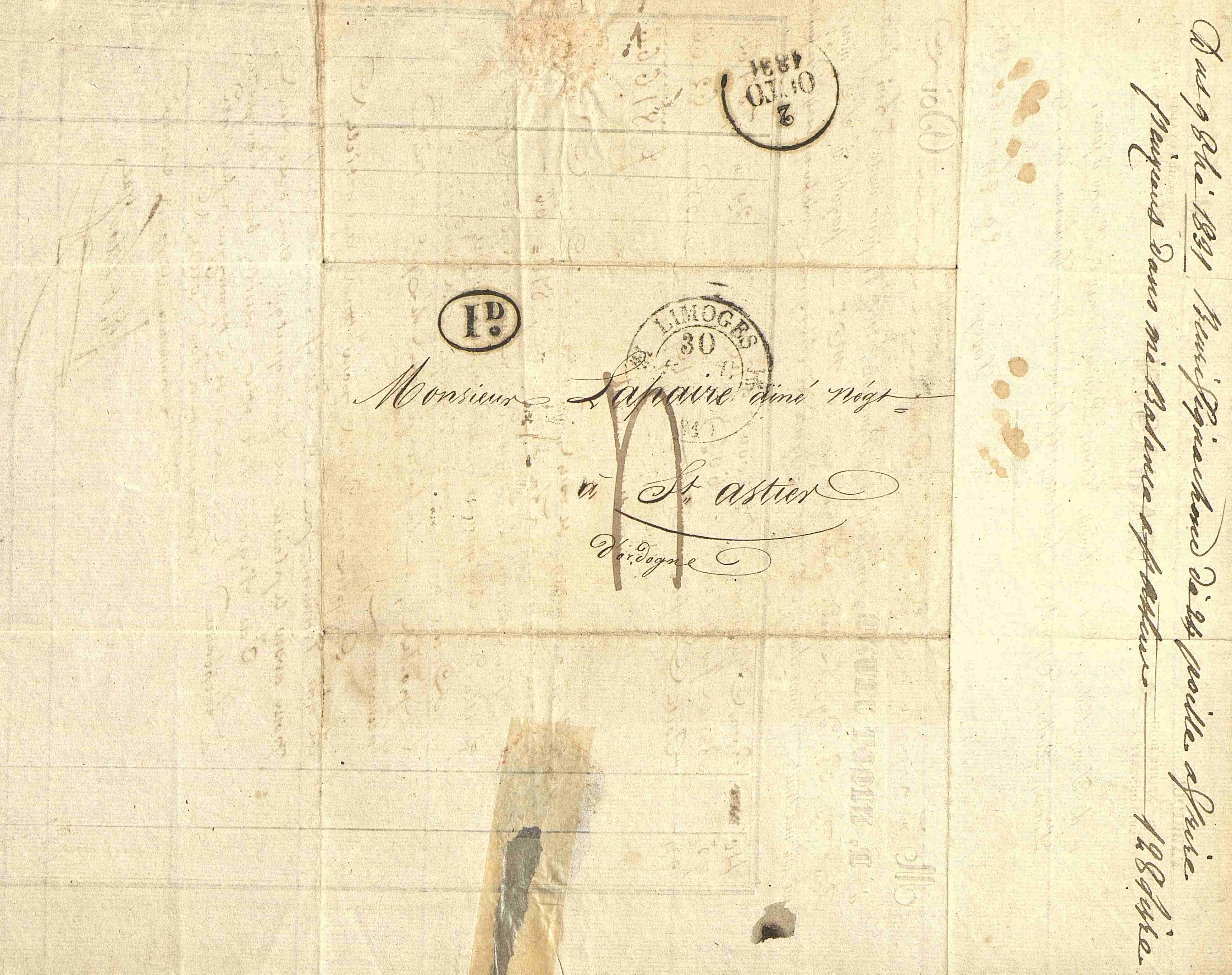 Courrier-facture, de M. F. Nicot, Magasin des fils de fer et fer rond pour chaudronnerie à Limoges. Imprimé avec de nombreuses mentions manuscrites. Facture adressée à M. Lapaire de St-Astier.