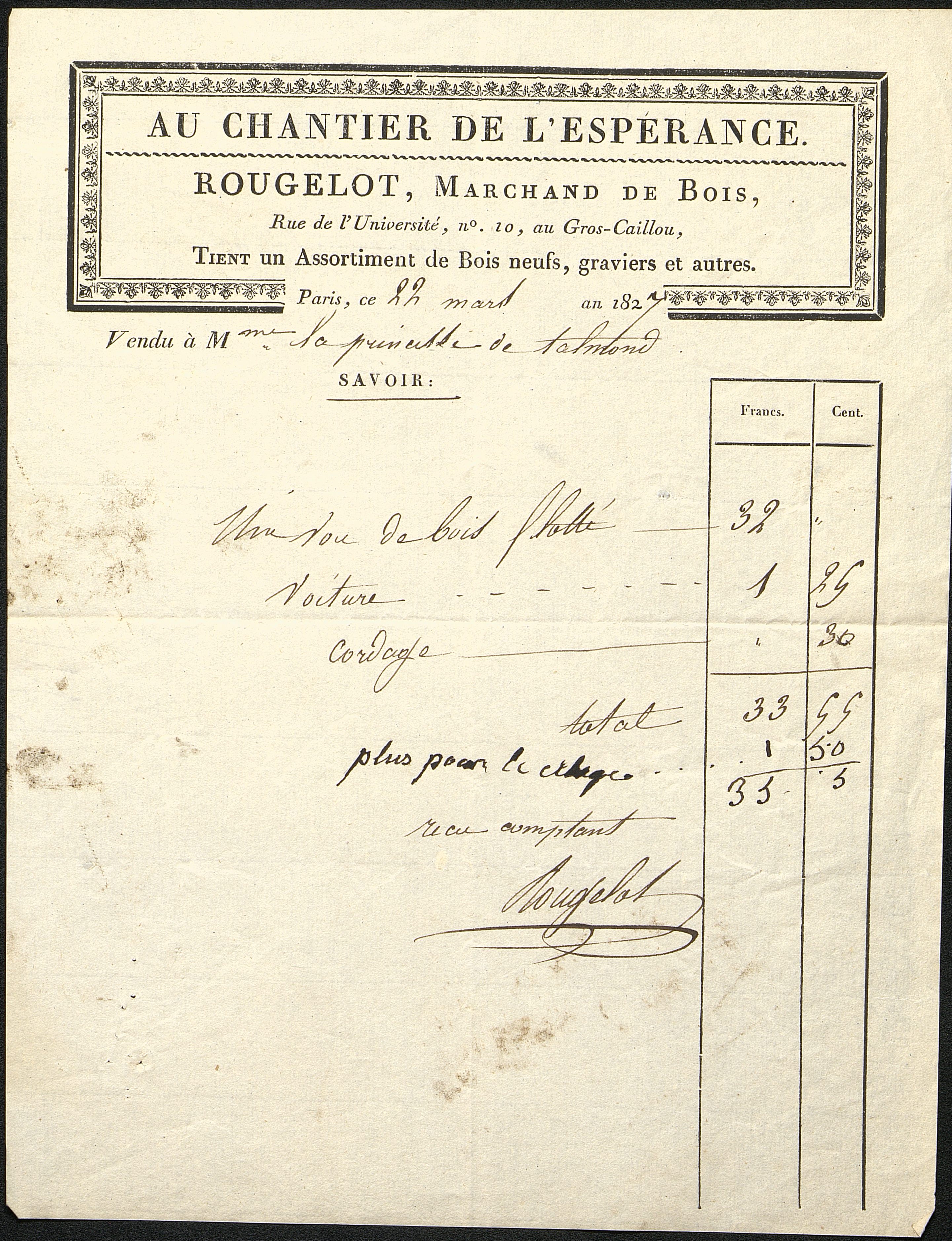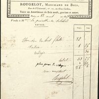 Au Chantier de l'espérance, Rougelot, marchand de bois. Facture portant de nombreuses mentions manuscrites. Vente à Mme la princesse de Talmond.