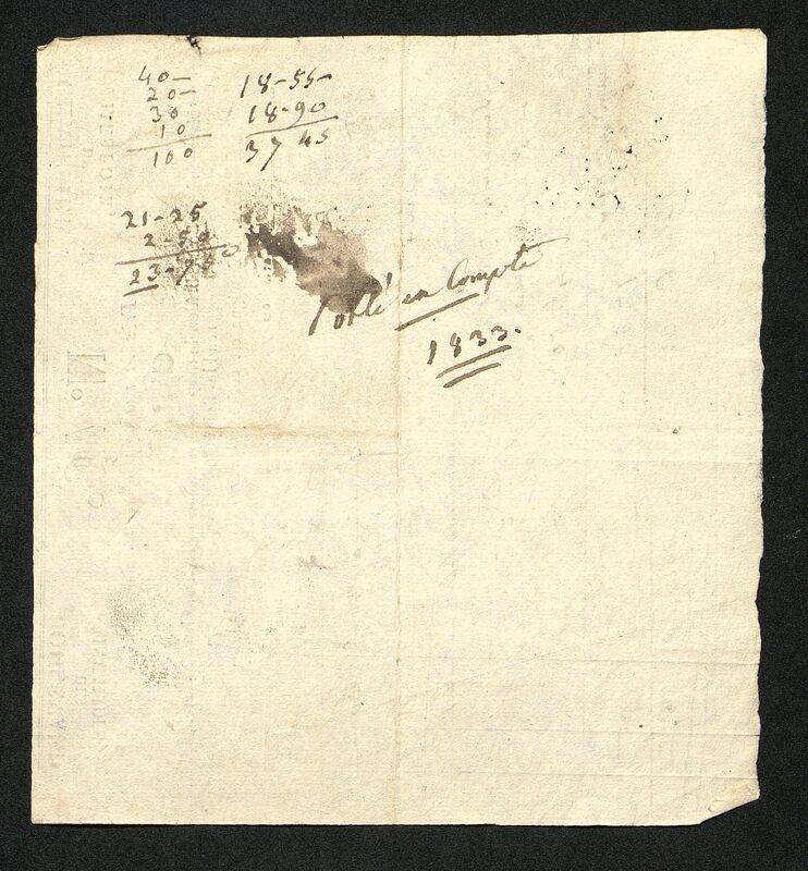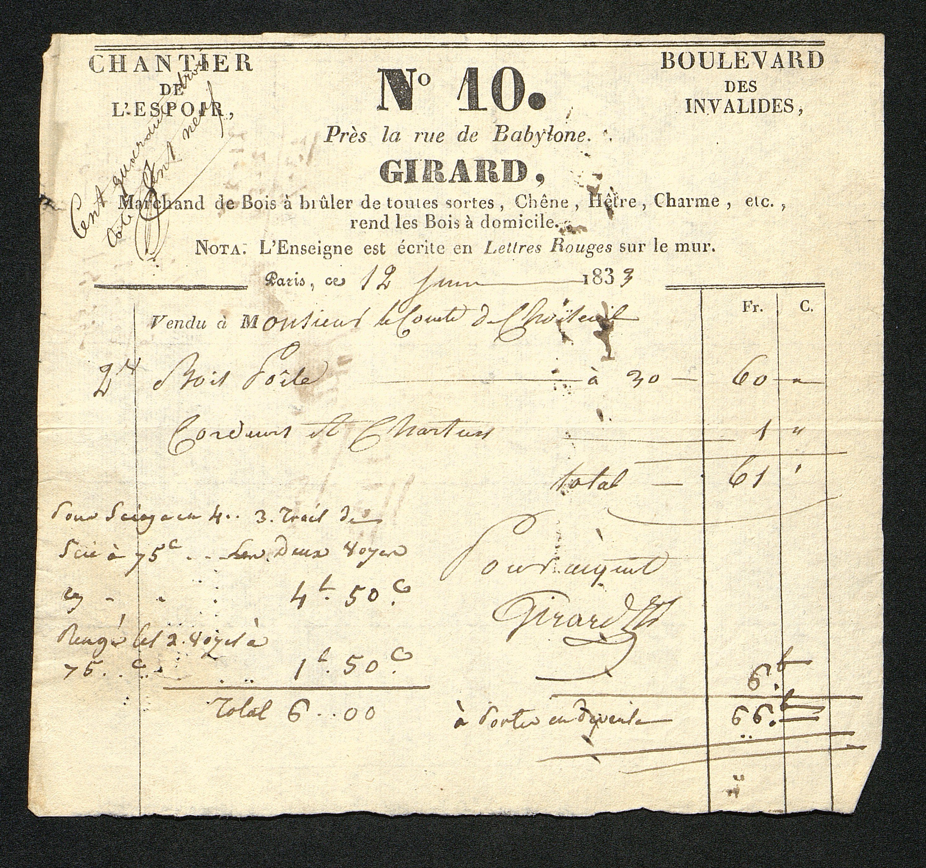 Facture de marchand de bois. Girard propriétaire. Facture sur imprimé avec de nombreuses mentions manuscrites sur les deux faces.