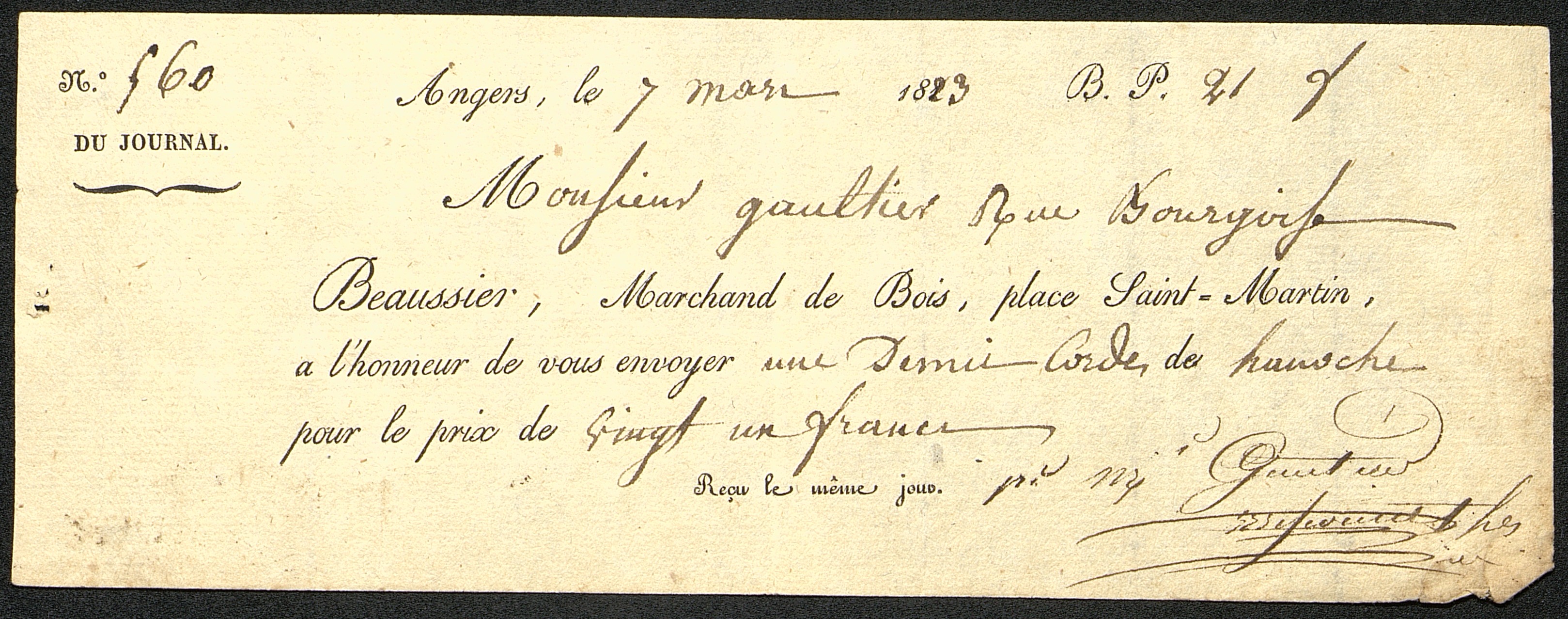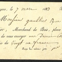 - Reçu pour M. Gaultier au sujet d'une commande honorée par M. Beaussier, marchand de bois à Angers.