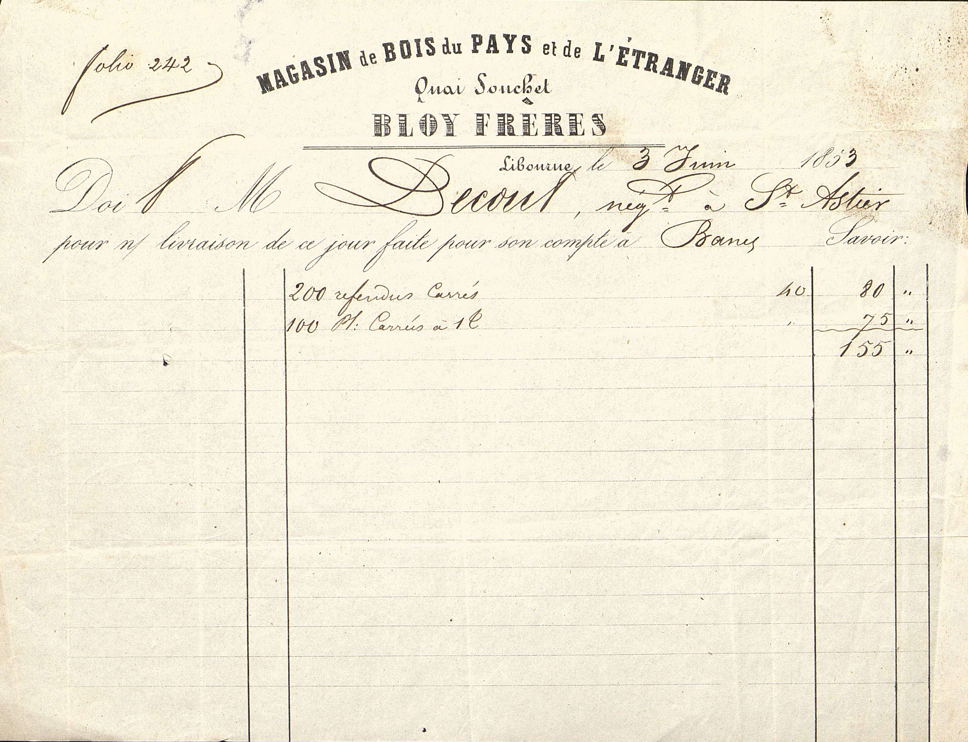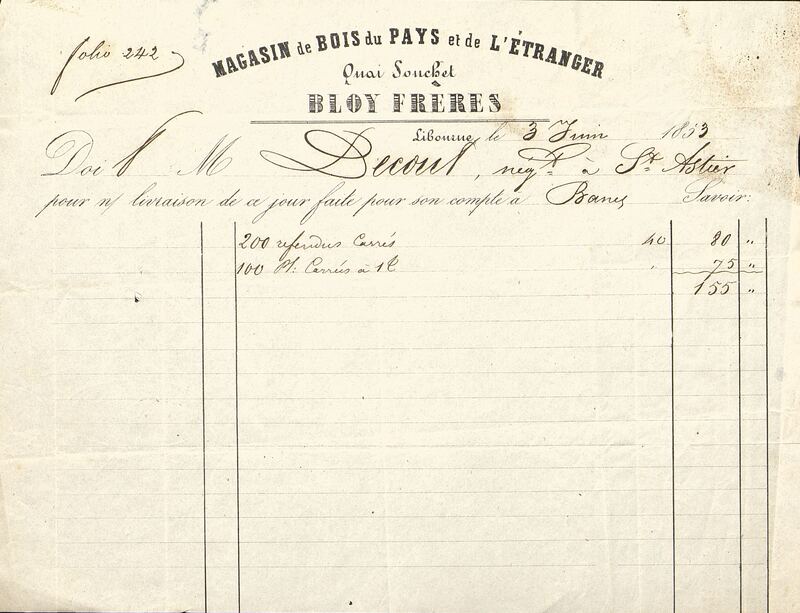 Magasin de bois de pays et de l'étranger . Livraison à Banes pour M Decout négociant à St-Astier. Folio 242.